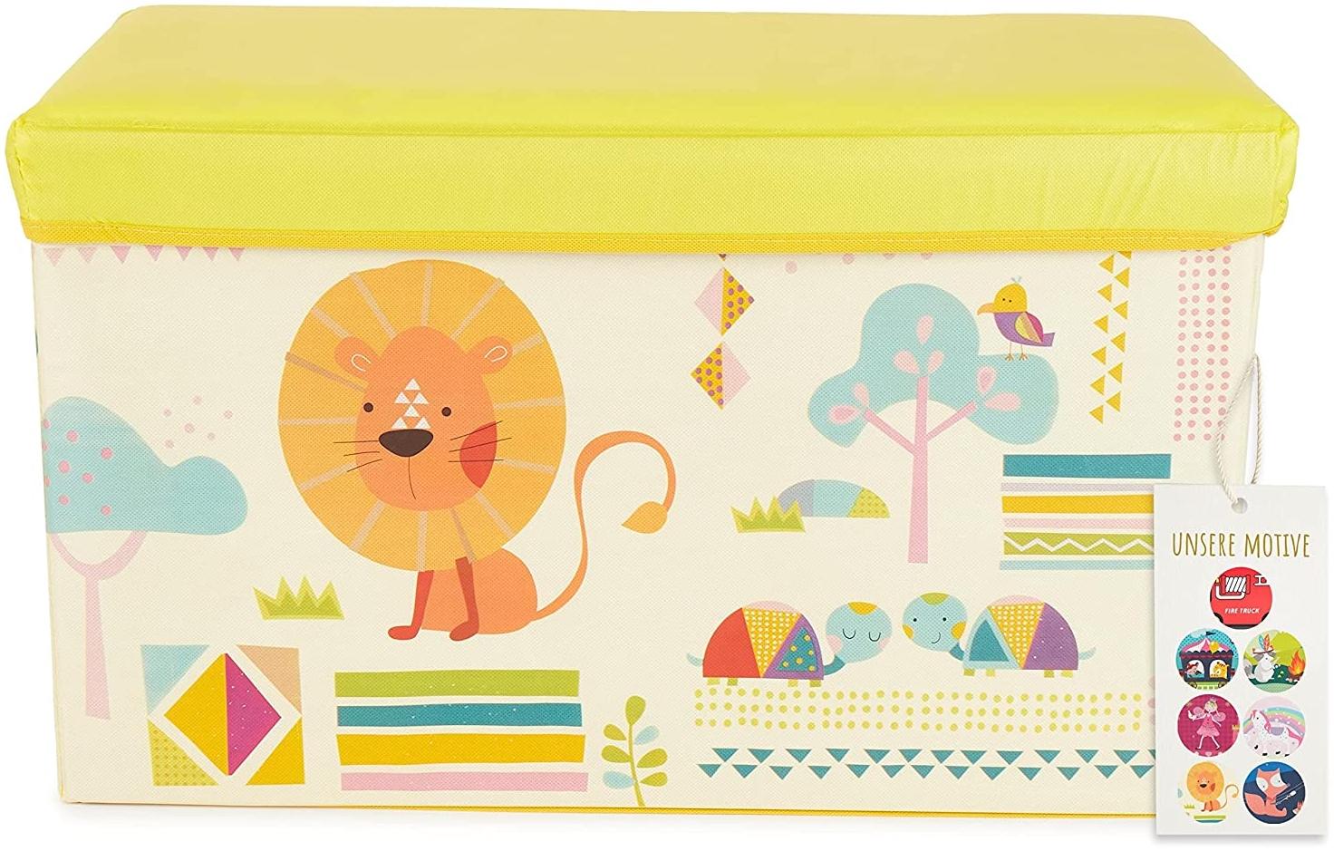 Die Bieco 'Zoo' Aufbewahrungsbox mit Sitzbank in Gelb sorgt für Ordnung im Kinderzimmer. Das wunderschöne Design mit bunten Tieren und die großzügigen Maße von 60 x 30 x 35 cm bieten viel Stauraum. Der gepolsterte Deckel dient als bequeme Sitzbank. Die Box lässt sich bei Nichtgebrauch platzsparend zusammenfalten. **Highlights** - Praktische Sitzbankfunktion - Großzügiges Fassungsvermögen von 66 Litern - Wunderschönes "Zoo" Design mit bunten Tieren - Platzsparend zusammenfaltbar - Vielseitig für Spielzeug, Bücher und mehr **Produkteigenschaften** - Maße: 60 x 30 x 35 cm - Material: Stoff - Gepolsterter Deckel - Farbe: Gelb - Fassungsvermögen: 66 Liter