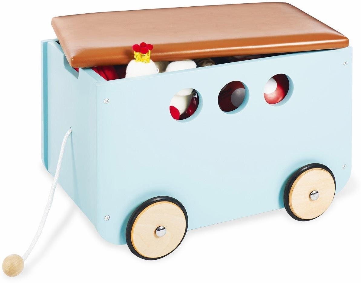 So macht Ordnung Spaß! In der Spielzeugkiste ‚Jim' ist genügend Platz um alle liebsten Dinge im Nu darin zu verstauen; dank der praktischen Zugschnur können die Spielsachen überall mit hingenommen werden **Warnhinweise:** Achtung! Benutzung unter unmittelbarer Aufsicht von Erwachsenen. - Der Deckel ist abnehmbar und kann mit bis zu 20 kg belastet werden; durch die Polsterung kann die Truhe auch als bequeme Sitzgelegenheit genutzt werden, bevor kleine Entdecker sich in das nächste Abenteuer stürzen - Mit dem Farbmix aus Mint und Braun liegt die Spielzeugkiste absolut im Trend und wird zum echten Hingucker in jedem Kinderzimmer. - Hochwertige Pinolino Qualität; lackiert: MDF Uni, mint lackiert und Kunstleder, braun; Maße L 50 cm, B 36 cm, H 36 cm, Lieferumfang umfasst eine Spielzeugkiste mit Rollen, Montage erforderlich. - Empfohlen für Kinder ab 3 Jahren. - Pflege: die Spielzeugkiste kann mit einem trockenen Fensterleder oder einem weichen, flusenfreien Baumwolltuch abgewischt werden. - Zusätzliche Spielzeuge nicht im Paket enthalten.