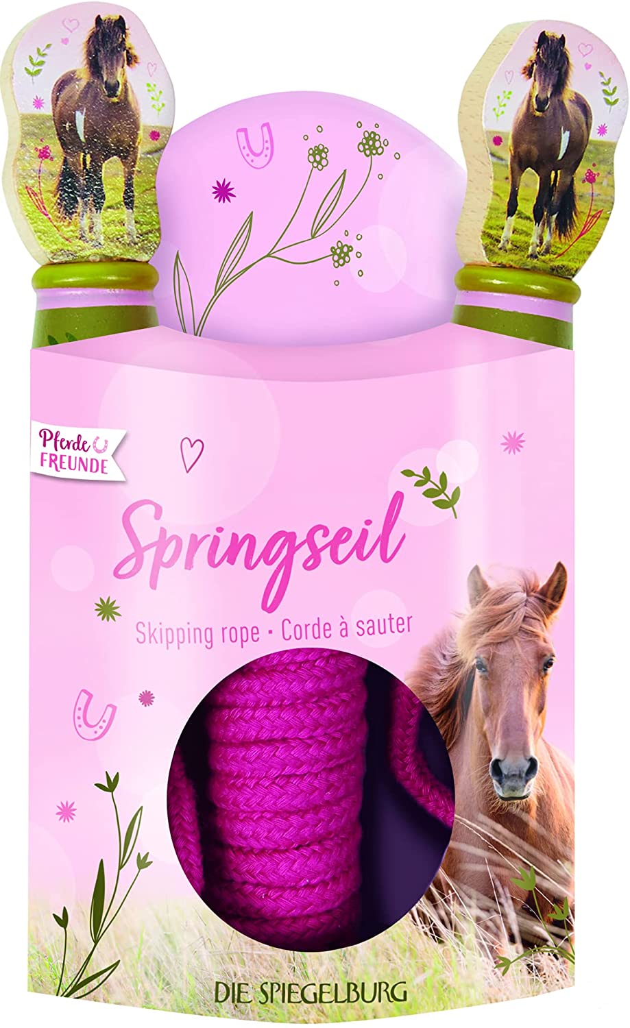- Das Springseil ist in frischen Frühlingsfarben gestaltet und richtet sich an Pferdefans.