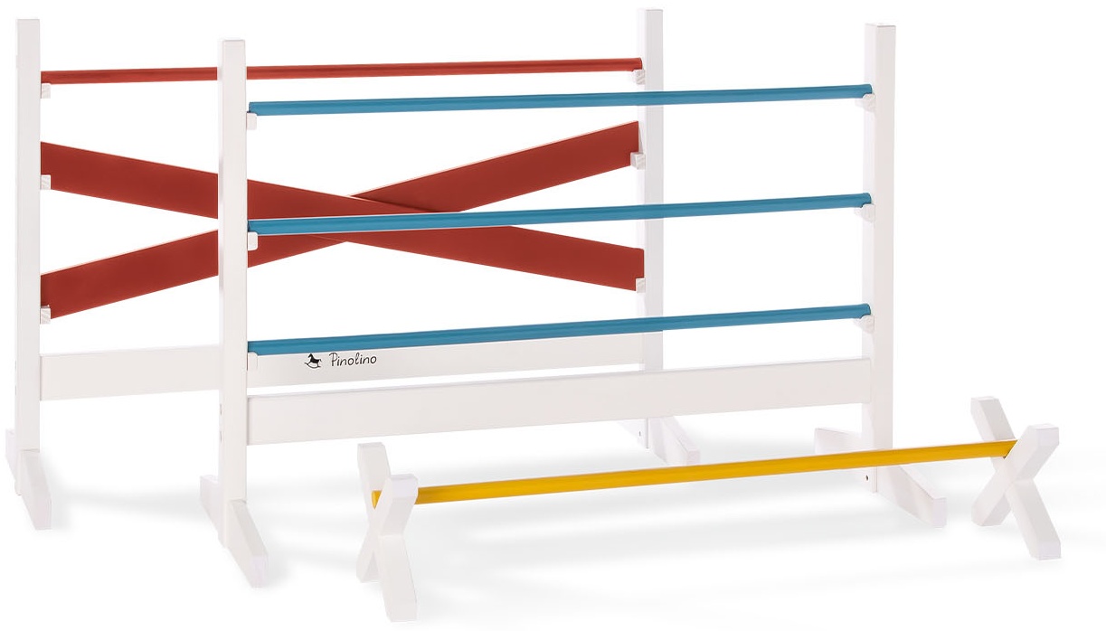 - Pinolino Hindernishürde Set 'Jumper', bunt, Maße: Steilsprünge: B 89 x T 34 x H 62 cm; Cavaletti: B 89 x T 16 x H 16 cm, empfohlen ab 3 Jahren, FSC®-zertifiziert (FSC-C120795), Teilmontage erforderlich - Das vollmassive Holzspielzeug lässt Kinderherzen höherschlagen. Der Fantasie kann freien Lauf gelassen werden und sind keine Grenzen gesetzt, wenn es darum geht, über die Hürden zu springen oder einen Parkour aufzubauen - Mit den farbenfrohen Hindernishürden können tolle Reitturniere und Wetthüpfen veranstaltet werden. Hier ist für Mädchen und Jungen ab einem Alter von 3 Jahren eine Menge Spaß vorprogrammiert - Das Hürden-Set ist FSC®-zertifiziert und ist eine super Geschenkidee zu Weihnachten, Ostern oder zum Geburtstag - Pinolino erfüllt seit 1997 Kinderträume und vertreibt Kindermöbel, Accessoires und Spielwaren. Das deutsche Unternehmen verwendet nur für Kinder geeignete Lacke, Lasuren und Öle und bietet viele FSC®-zertifizierte Produkte an