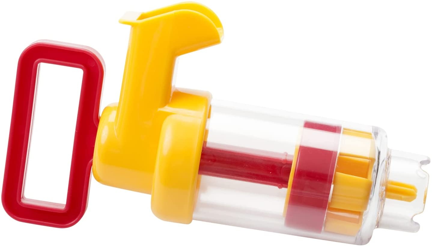 - Das Aquaplay Wasserpumpen-Spielzeug ist in leuchtenden Gelb- und Rottönen gestaltet