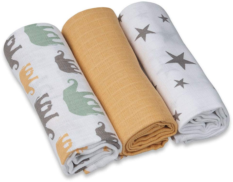 in SpucktücherGrünspecht Mullwindeln 70x70cm aus 100 % BaumwolleSpucktücher, ohne optische Aufheller, hautfreundlich & saugstark, 3 Stück, gelb, Sterne, Elefanten (1500-V6)