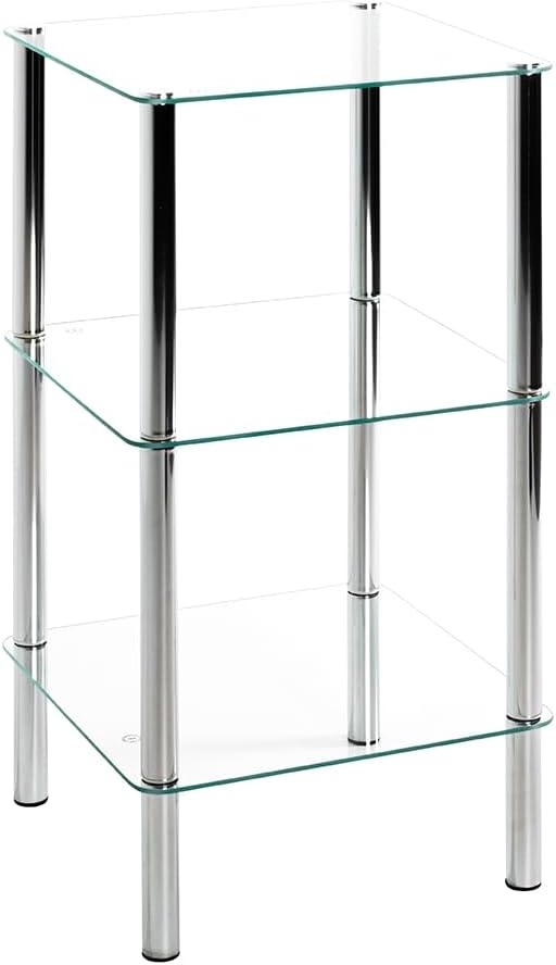 Das HAKU Möbel Regal vereint modernes Design mit Funktionalität. Mit einer Höhe von 77 cm und einer Glasplatte von 39 x 39 cm bietet es drei Fächer aus gehärtetem Sicherheitsglas und verchromtem Metall. Das Regal wiegt ca. 6 kg und ist besonders robust. Ideal als Beistelltisch oder Dekorationspräsentation, passt es in jeden Einrichtungsstil und verleiht Ihrem Zuhause eine besondere Atmosphäre. **Highlights** - Gehärtetes Sicherheitsglas mit Facettenschliff - Verchromtes Metallgestell - Zeitloses und dennoch modernes Design - Vielseitig einsetzbar - Robust und langlebig **Produkteigenschaften** - Abmessungen: Höhe 77 cm, Glasplatte 39 x 39 cm - Gewicht: ca. 6 kg - Material: Gehärtetes Sicherheitsglas, verchromtes Metall - Farbe: Klarglas, Chromoptik - Belastbarkeit: pro Ablage jeweils 5 kg