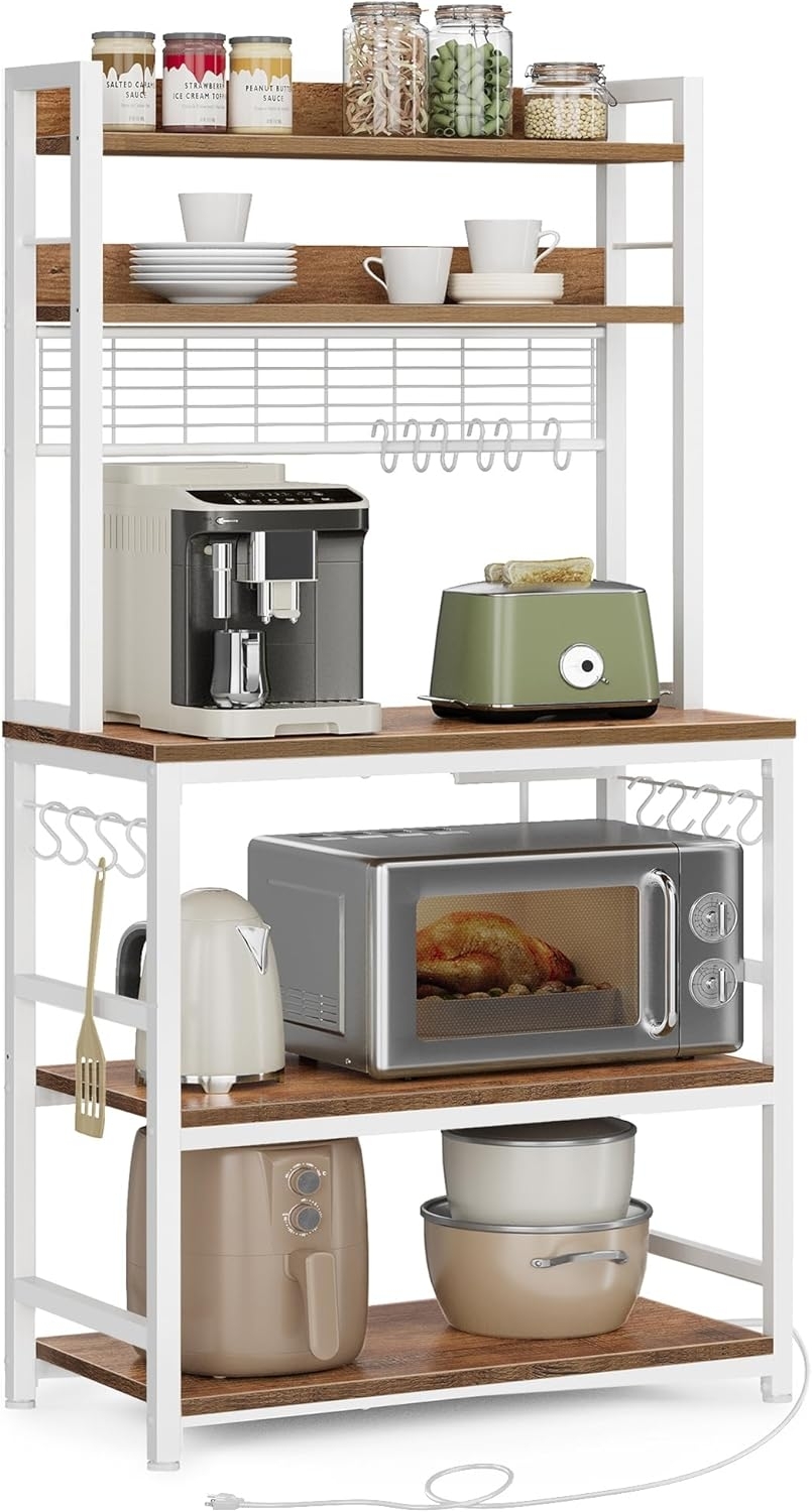 **Beschreibung:** - \[Küchenregal mit Steckdosen\] Die Steckdosenleiste verfügt über 4 Anschlüsse, an der Sie mehrere Geräte gleichzeitig aufladen können. Die max. Leistung beträgt 1875 Watt. Das eingebaute Design der Steckdosenleiste sorgt für ein ordentliches Kabelmanagement - \[Sicher und zuverlässig\] Die integrierte Steckdosenleiste dieses Standregals bietet Überlastschutz, Leckageschutz und kann, weil sie mit einem Ein-/Ausschalter ausgestattet ist, bei Nichtgebrauch ausgeschaltet werden – alles für die Sicherheit! - \[Verstellbare Ablage\] Die mittlere Ablage (max. Belastbarkeit: 59 kg) dieses Küchenregals kann um 4,1 cm nach oben oder unten verstellt werden, sodass Sie unterschiedlich große Utensilien unterbringen, vom kleinen Toaster über den Mixer bis zur Mikrowelle - \[Geräumig\] Dieses All-in-one-Regal mit 5 Ablagen für Ihre Mikrowelle, Kaffeemaschine, Fritteuse und andere Geräte, 14 S-förmige Haken zum Aufhängen von Tassen oder Löffeln an der Gitterplatte oder an den Seitenstangen bringt Ordnung in Ihre Küche! - \[Robust, stabil, stilvoll\] Die hochwertigen, rustikalen Spanplatten und der stabile **schwarze**Stahlrahmen ergeben einen schicken, robusten Mikrowellenständer, der Ihren Raum aufwertet und bis zu 274,5 kg trägt - \[Keine Sorge um den Aufbau\] Mithilfe einer klaren Anleitung und gekennzeichneter Teile lässt sich dieses stehende Küchenregal im Handumdrehen aufbauen. Sie können so schnell wie möglich damit beginnen, Ihre Küchentheke aufzuräumen! **Produktdetails:** - Farbe: **Vintagebraun-Weiß** - Material: Holzspanplatte, Stahl - Größe: 40 x 80 x 170 cm (T x B x H) - Gewicht: 21,1 kg - Max. statische Belastbarkeit jeder oberen Ablage: 20,4 kg - Max. statische Belastbarkeit der Arbeitsfläche: 45,4 kg - Max. statische Belastbarkeit der mittleren Ablage: 59 kg - Max. statische Belastbarkeit der unteren Ablage: 59 kg - Max. statische Belastbarkeit pro Haken: 5 kg **Lieferumfang:** - 1 x Küchenregal - 1 x Zubehörpaket - 1 x Anleitung **VASAGLE Hinweise:** - Bitte befestigen Sie dieses Mikrowellen-Regal mit dem beiliegenden Kippschutz an der Wand, um eine sichere Nutzungsumgebung zu schaffen. - Wenn Sie versehentlich Wasser auf dieses Küchenregal verschütten, wischen Sie es sofort mit einem trockenen Tuch ab. - Kindern ist es aus Sicherheitsgründen untersagt, auf das Standregal zu klettern oder damit zu spielen.