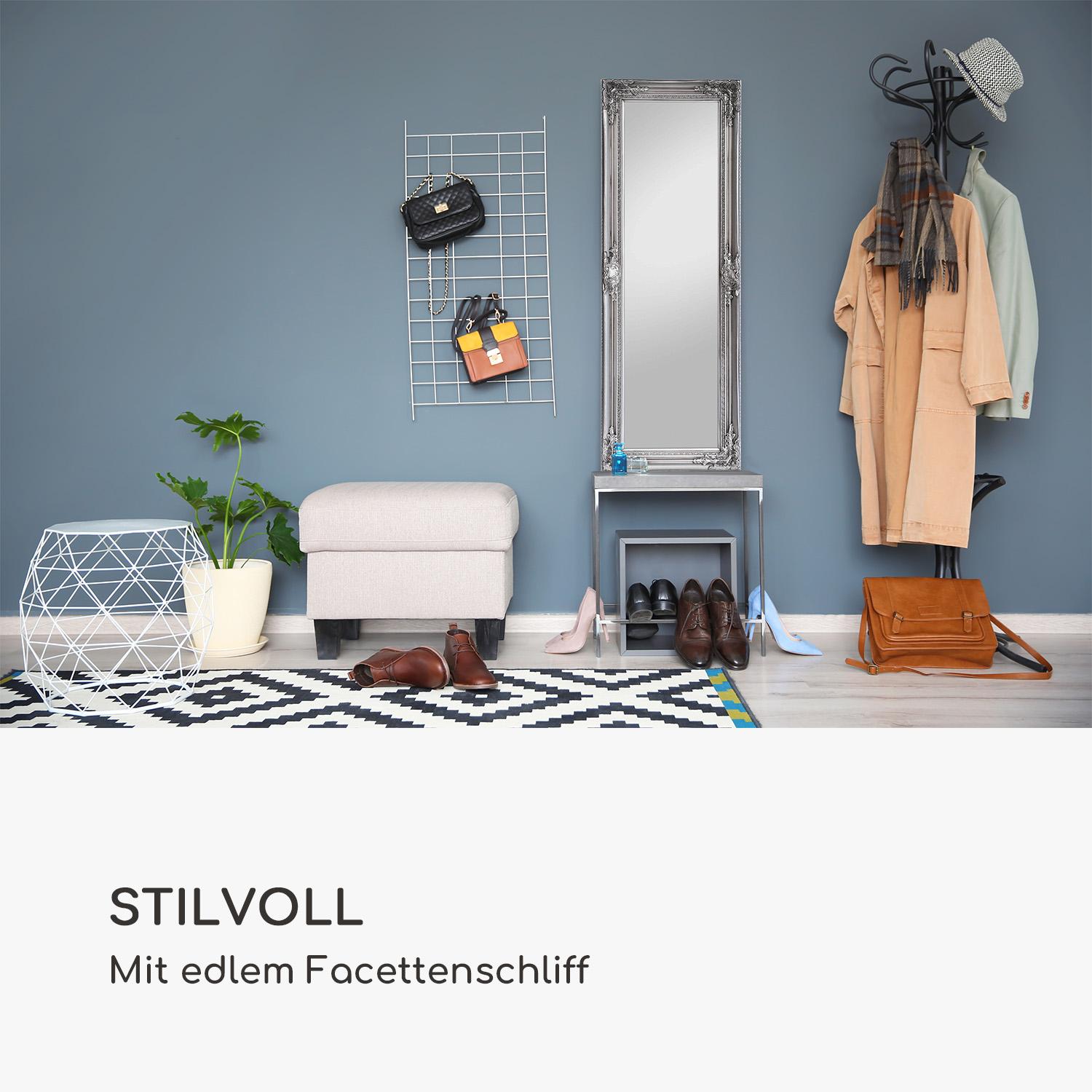 Der Ashford Standspiegel von Casa Chic by blumfeldt besticht durch seinen eleganten Massivholzrahmen mit Gipsapplikationen und verleiht jedem Raum einen besonderen visuellen Akzent. Mit einem Facettenschliff und Abmessungen von 130 x 45 cm ist der Spiegel sowohl im Hoch- als auch im Querformat vielseitig einsetzbar. Der abnehmbare Standfuß ermöglicht eine flexible Nutzung als Aufsteller oder Wandspiegel. **Highlights** - Massivholzrahmen mit Gipsapplikationen für einen eleganten Look - Facettenschliff für besondere Lichtreflexionen - Abnehmbarer Standfuß für flexible Nutzung - Geeignet für Hoch- und Querformat - Ideal für Wohnzimmer, Badezimmer, Schlafzimmer und Flur **Produkteigenschaften** - Abmessungen: 130 x 45 cm - Material: Massivholz - Farbe: Silber **Lieferumfang** - 1 x Wandspiegel - 1 x Standfuß
