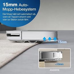 - Mit dem intelligenten 15mm Auto-Mopp Hebesystem werden die Wischplatten um 15 mm angehoben, sobald der Roboter einen Teppich erkennt oder durch einen gereinigten Bereich fährt