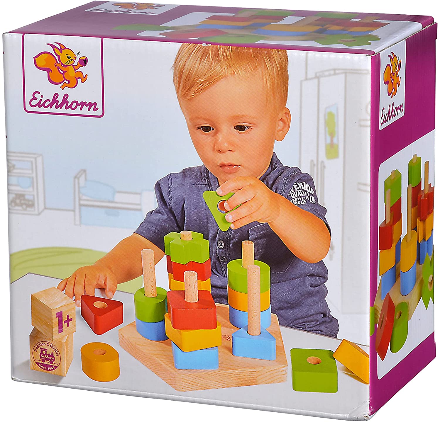 | Name | Eichhorn Steckplatte, 21-teilig, Buchenholz, 5 verschiedene Stecksymbole, 20 Steckteile, für Kinder ab 12 Monaten, Größe: 18 x 10 cm |