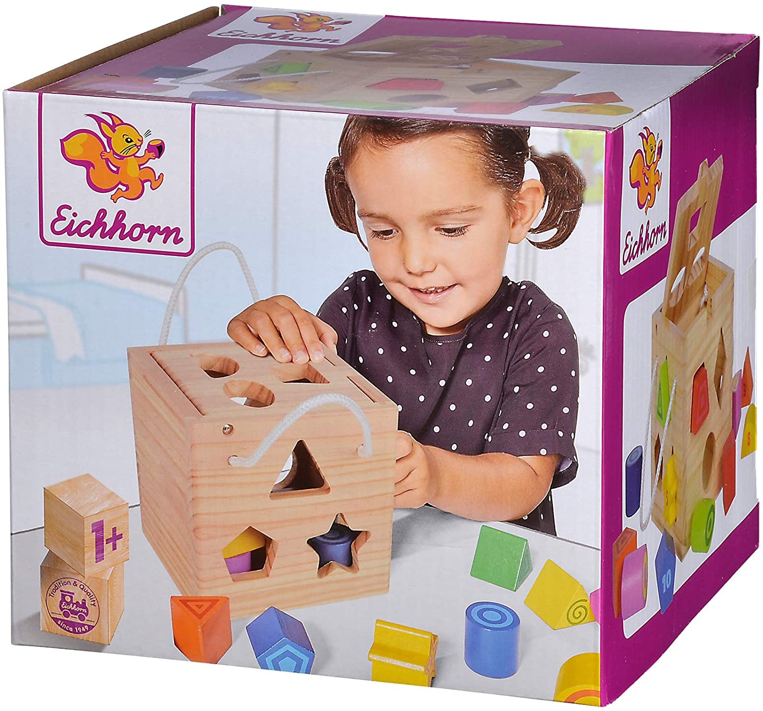 | Name | Eichhorn Steckwürfel aus Holz, Kiefernholz, Motorikwürfel mit 12 Steckbausteinen, Holzspielzeug für Kinder ab 12 Monaten, Größe: 14,5x14,5x14,5 cm |