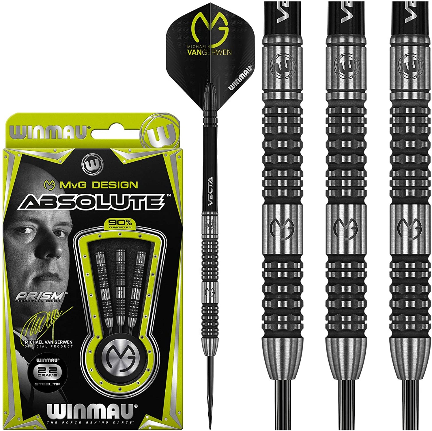 - Die Winmau Michael van Gerwen Absolute Steeldarts bestehen aus 90 % Tungsten, was für eine hohe Dichte und Langlebigkeit sorgt.