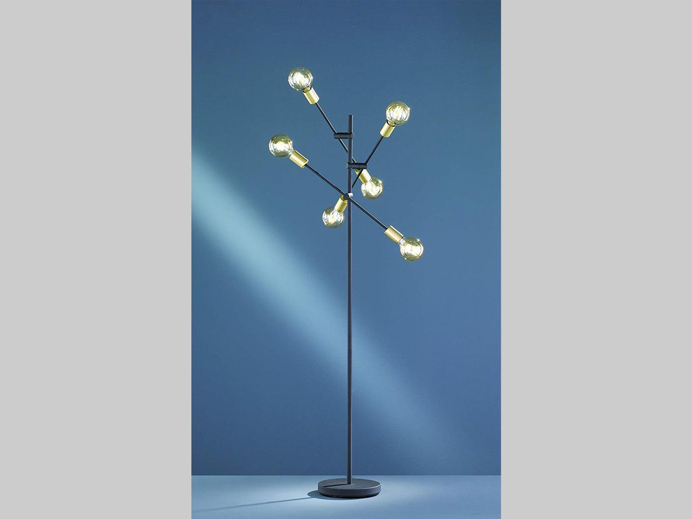 Die Design Stehleuchte CROSS von TRIO Leuchten vereint modernes Design mit Funktionalität. Mit einer Höhe von 165 cm und einem Durchmesser von ca. 54,5 cm setzt sie stilvolle Akzente in Ihrem Wohn- oder Eingangsbereich. Die 6-flammige Leuchte bietet Platz für 6 x E27-Leuchtmittel bis max. 28 W und verfügt über schwenkbare Arme sowie einen bequemen Fußschalter für eine flexible Nutzung. **Highlights** - Schwenkbare Arme für vielseitige Einsatzmöglichkeiten - Empfohlen für Filament Leuchtmittel für harmonisches Erscheinungsbild - Bequemer Fußschalter für einfache Bedienung - Modernes Design mit schwarzem Metallgestänge und bronzefarbenen Fassungen - Geeignet für 6 x E27-Leuchtmittel bis max. 28 W **Produkteigenschaften** - Höhe: 165 cm - Durchmesser: ca. 54,5 cm - Material: Metall - Farbe: Schwarz & Bronze - Fassungen: 6 x E27 - Leistung: max. 28 W **Lieferumfang** - Stehleuchte CROSS von TRIO Leuchten - Ohne Leuchtmittel