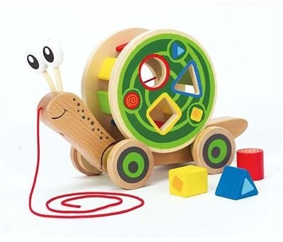 - Das bunte Schneckenhaus dient als Formensortierer, in dem Holzklötze transportiert werden können.
