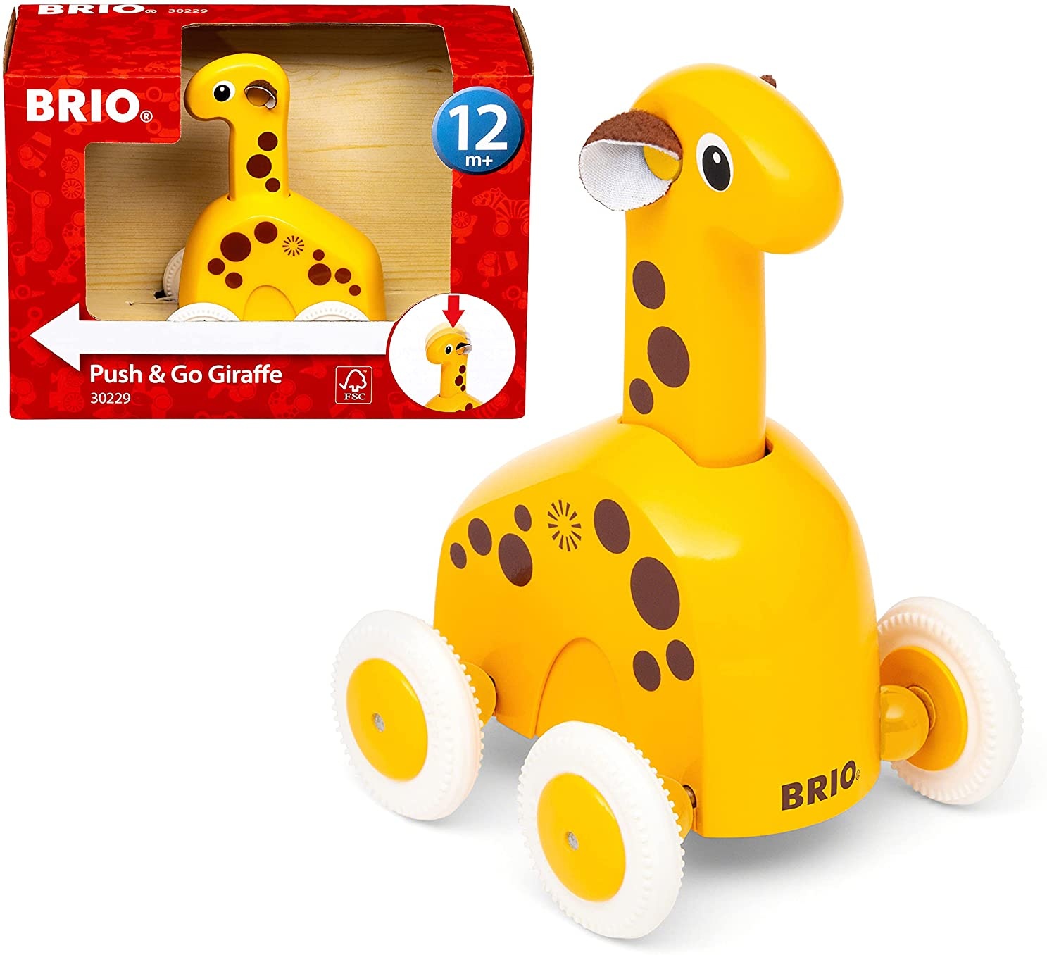 - Die BRIO Push & Go Giraffe ist ein pädagogisches Spielzeug, das die altersgemäßen Fähigkeiten von Kleinkindern fördert.
