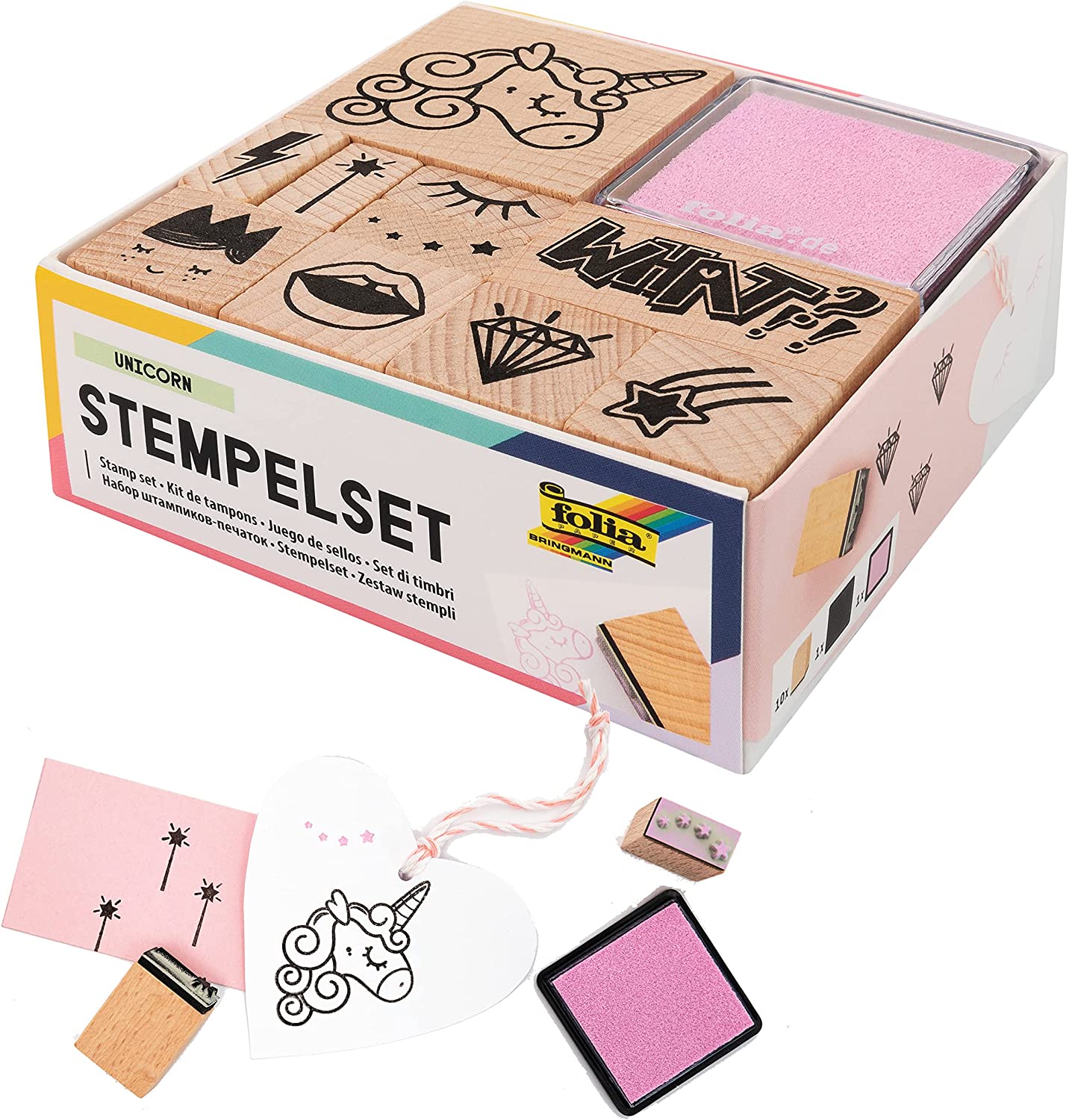 folia 31102 - Holzstempelset Unicorninklusive 10 Holzstempel und 2 Stempelkissen - ideal zum Verzieren von Karten, Freundschaftsbüchern, für Lettering und Scrapbooking