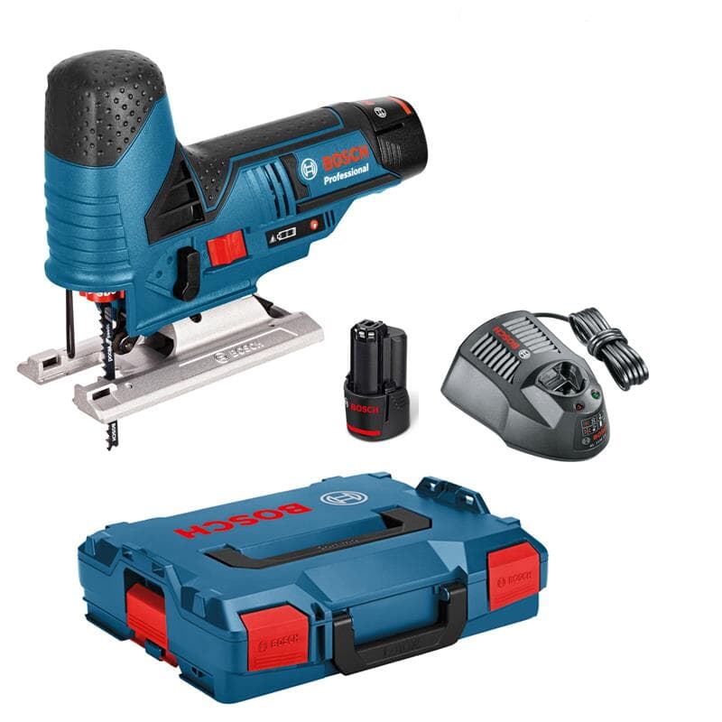 Bosch Professional 12V System Akku Stichsäge GST 12V-70 (2x Sägeblatt, Gleitschuh, Spanreißschutz, Schnitttiefe in Holz: 70 mm, 2x 3.0Ah Akkus und Ladegerät, in L-Boxx)