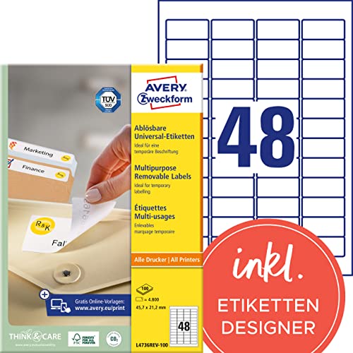 in StickerAVERY Zweckform L4736REV-100 Universal Etiketten (4.800 Klebeetiketten, 45,7x21,2mm auf A4, wieder rückstandsfrei ablösbar/abziehbar, individuell bedruckbare, selbstklebende Aufkleber) 100 Blatt, weiß