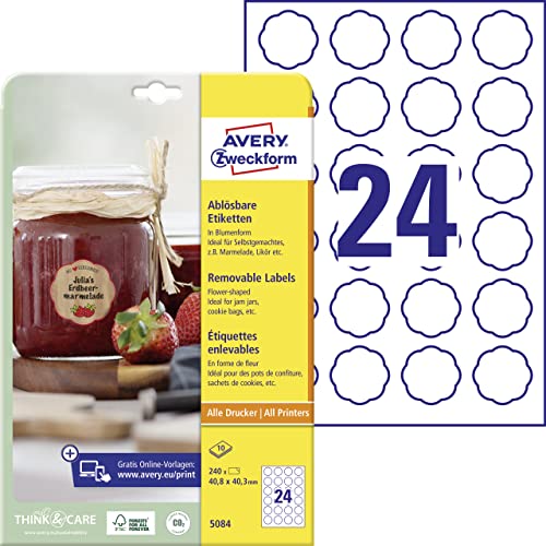 AVERY Zweckform Marmeladenetiketten Art. 5084 (240 Aufkleber ablösbar, 40,8x40,3mm, Blumenform, FSC-zertifiziert, für Einmachgläser, Geschenke) - 10 Blatt, weiß