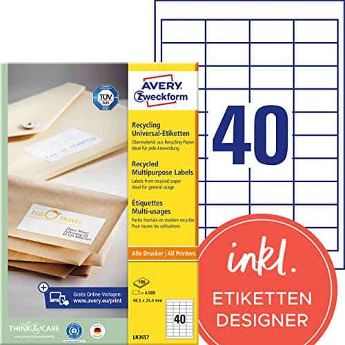 in StickerAVERY Zweckform LR3657 Recycling Etiketten (4.000 Klebeetiketten, 48,5x25,4mm, 100% recyceltes Altpapier, selbstklebend) 100 Blatt, naturweiß