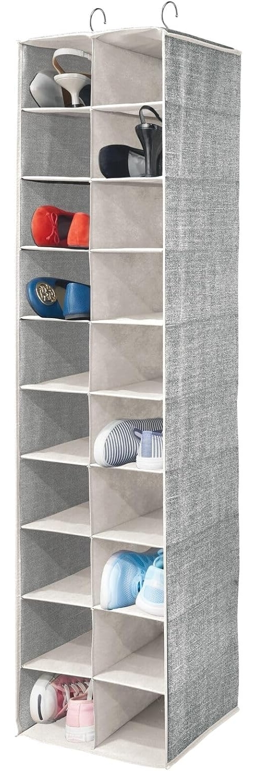 Mit dem Hängeaufbewahrung Organizer von mDesign bringen Sie Ordnung in Ihren Flur oder Ihr Kinderzimmer. Der platzsparende Organizer aus atmungsaktiver Kunstfaser bietet in seinen 20 Fächern ausreichend Stauraum für Schuhe, Handtaschen, Spielzeug und mehr. Dank der einfachen Anbringung an der Kleiderstange ist er sowohl funktional als auch dekorativ. Pflegeleicht und strapazierfähig, ist dieser Hängeschrank die ideale Lösung für Ihre Aufbewahrungsbedürfnisse. **Highlights** - 20 Fächer für vielseitige Aufbewahrung - Platzsparendes Design für optimale Raumnutzung - Atmungsaktive Kunstfaser für Strapazierfähigkeit - Pflegeleicht, einfach mit feuchtem Tuch zu reinigen - Ideal für Flur, Schlaf- oder Kinderzimmer **Produkteigenschaften** - Maße: 29,8 x 30,5 x 127,0 cm - Material: atmungsaktive Kunstfaser - Farbe: Schwarz/Creme - Modellnummer: 11377MDCOEU **Lieferumfang** - 1x Hängeregal mit 20 Fächern Schwarz-Creme inkl. 2 Haken - Lieferung ohne Dekorationsmaterial