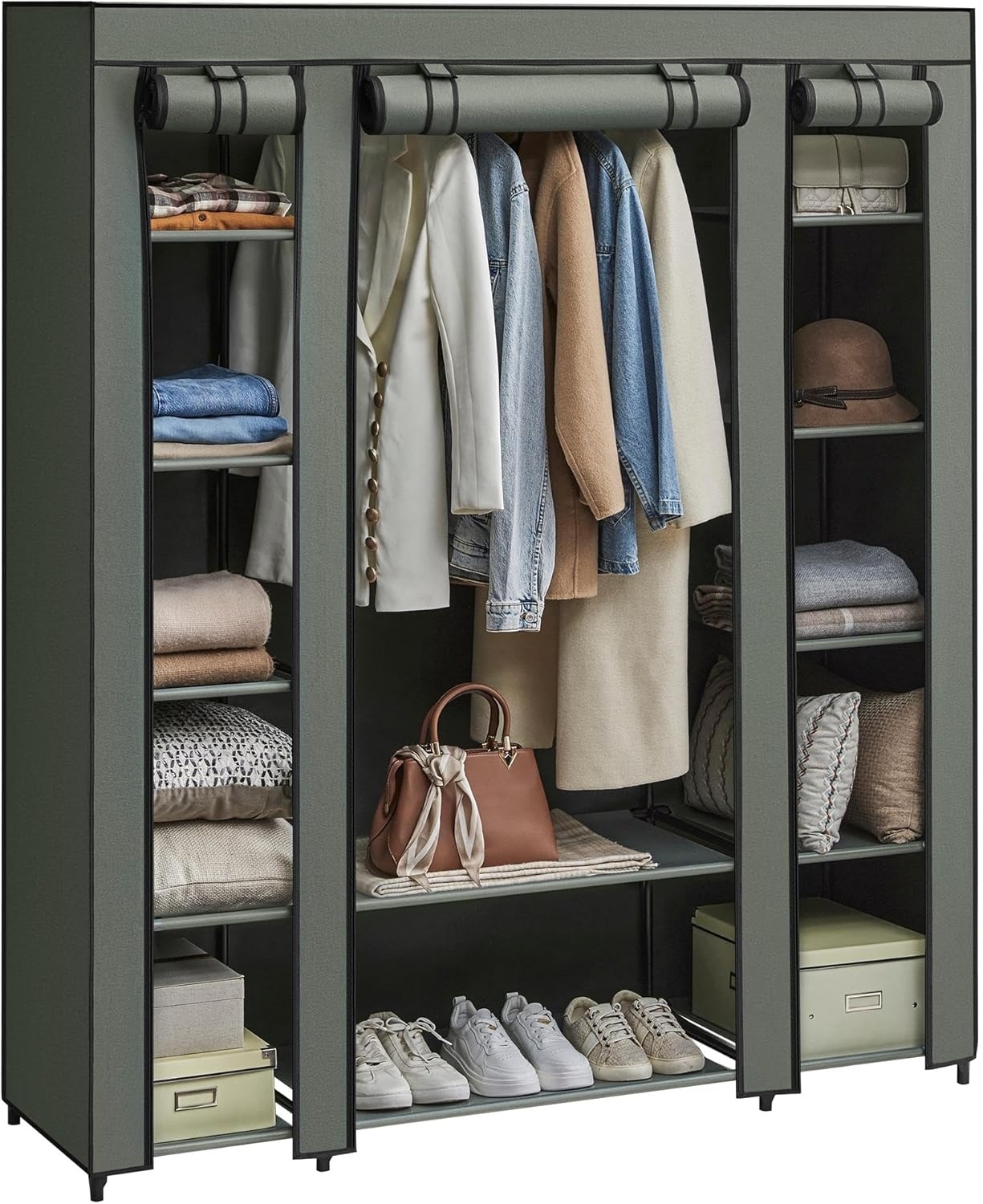 Songmics Kleiderschrank Stoffschrank, mit Überzug aus Vliesstoff, Faltschrank mit Kleiderstange, 45 x 150 x 175 cm, 12 Ablagen, Metallrahmen, Schrank fürs Schlafzimmer, salbeigrün LSF003C02