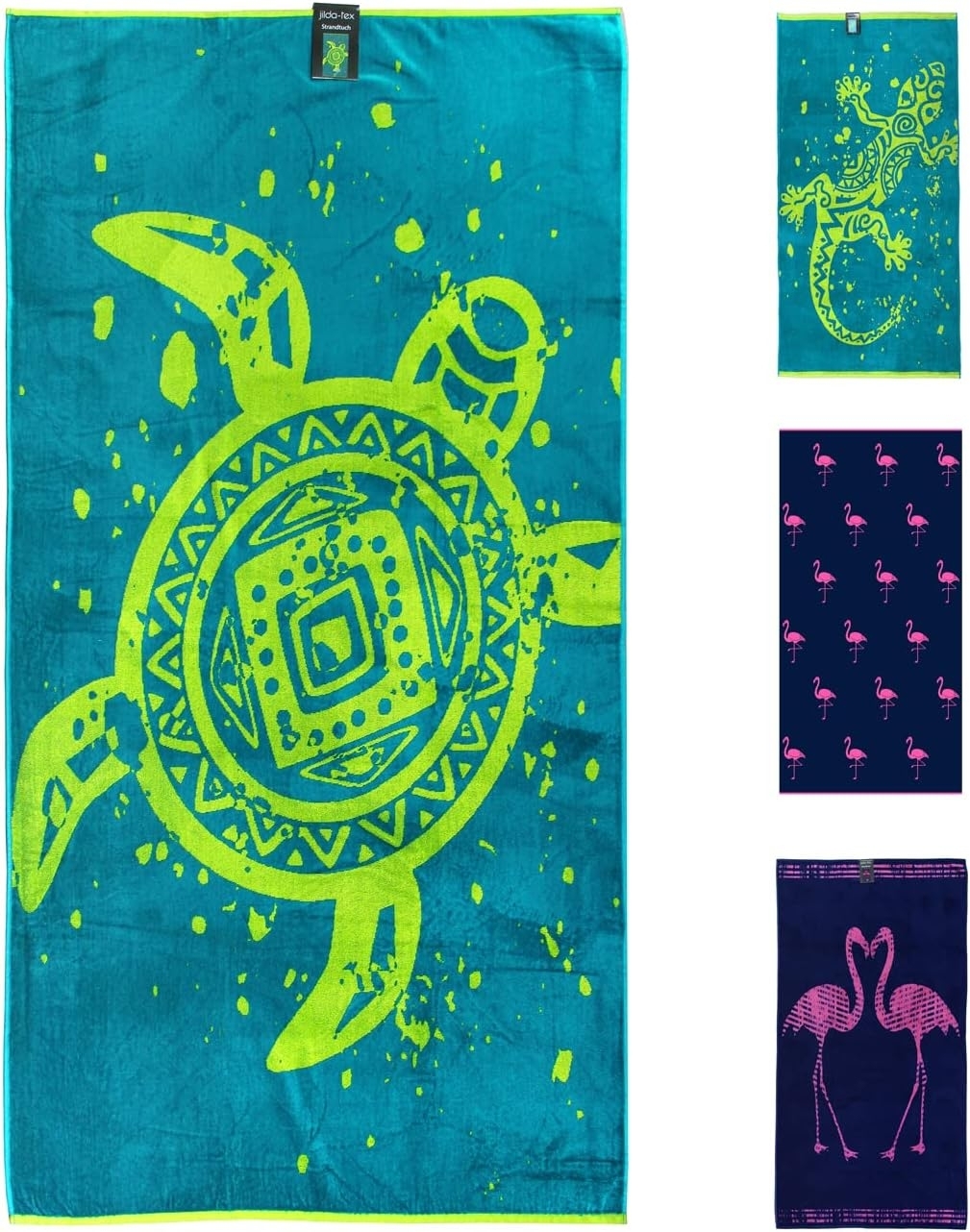 Mit dem jilda-tex Strandtuch aus weicher Frottee-Veloursqualität genießen Sie höchsten Komfort am Strand, Pool oder in der Sauna. Das XXL-Strandtuch misst 90x180 cm und überzeugt durch seine hochwertige Verarbeitung aus 100 % Bio Baumwolle. Die saugstarke und schnelltrocknende Eigenschaft macht es zum idealen Begleiter für jeden Anlass. Zudem ist es hautfreundlich und für Allergiker geeignet. **Highlights** - 100 % Bio Baumwolle für ein angenehmes Hautgefühl - Saugfähig und schnelltrocknend für optimalen Komfort - Waschmaschinen- und trocknergeeignet bis 40 Grad - Schadstoffgeprüft für unbedenklichen Gebrauch - Farbenfrohe Motive für Urlaubsstimmung das ganze Jahr über **Produkteigenschaften** - Maße: 90x180 cm - Vorderseite: Velours (Liegeseite) - Rückseite: Frottee (zum Abtrocknen) - Hautfreundlich und für Allergiker geeignet - Vielseitig einsetzbar: Strand, Pool, Sauna, Duschhandtuch