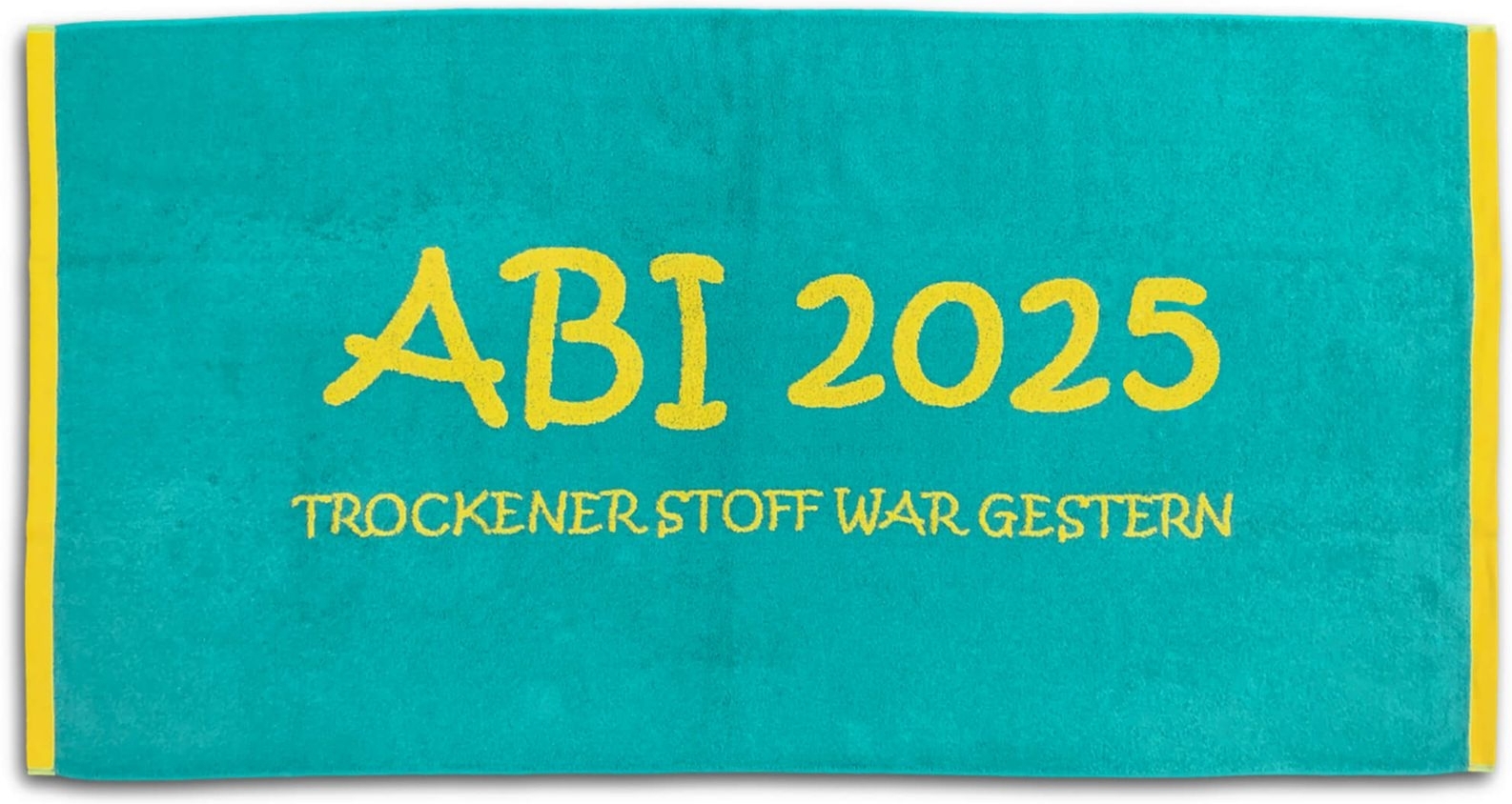 Das Abi Strandlaken 2025 in Türkis Lime ist das perfekte Accessoire für den Sommer. Hergestellt aus 100 Prozent Baumwolle in Jacquard Webart, bietet es ein anschmiegsames, weiches und saugstarkes Frottee. Der coole Spruch „ABI 2025 TROCKNER STOFF WAR GESTERN“ auf dem türkisfarbenen Hintergrund macht es zu einem echten Hingucker. Ideal für den Strand, Pool oder Schwimmbad und ein tolles Geschenk zum bestandenen Abitur. **Highlights** * Anschmiegsames, weiches und saugstarkes Frottee Strandtuch aus 100 Prozent Baumwolle in Jacquard Webart * Cooler gelber Spruch (ABI 2025 TROCKNER STOFF WAR GESTERN) auf türkisfarbenem Hintergrund * Perfektes Geschenk zum bestandenen Abitur, fesches Accessoire für Besuche am Strand, Pool oder im Schwimmbad * Öko-Tex Standard 100 Prüf-Nr. 171CIT, Maschinenwäsche bei 60 Grad, Trockner geeignet, pflegeleicht **Produkteigenschaften** * Maße: 80 x 160 cm * Material: 100 Prozent Baumwolle * Pflegehinweis: Maschinenwäsche bei 60 Grad, Trockner geeignet **Lieferumfang** - * 1x Strandlaken ABI 2025 Türkis Lime in der Größe ca. 80 x 160 cm