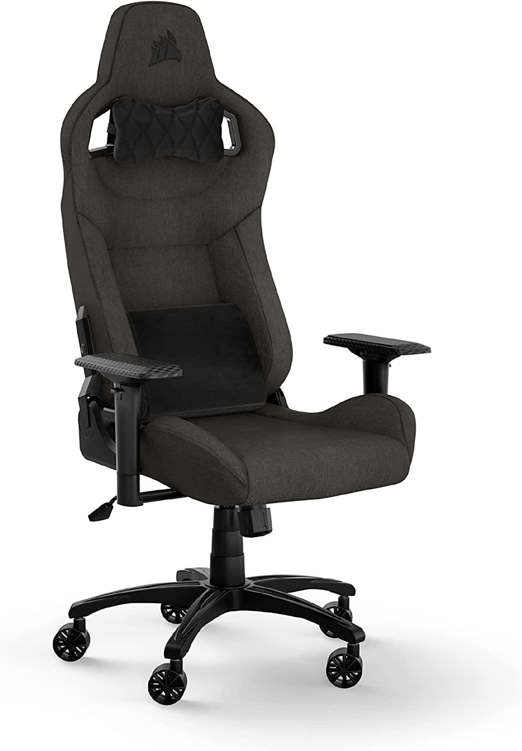 Der Corsair T3 Rush Gaming-Stuhl in Holzkohle vereint ergonomischen Komfort und Unterstützung, inspiriert vom Profirennsport. Der atmungsaktive Stoff sorgt für minimale Wärmespeicherung, ideal für lange Gaming-Sessions. Mit einem gepolsterten Nackenkissen und einer Lendenstütze aus Memory-Schaumstoff bietet er zusätzlichen Komfort. Der robuste, eingebaute Stahlrahmen und die verstellbaren 4D-Armlehnen garantieren eine optimale Anpassung. Die Sitzhöhe ist um 100 mm verstellbar. **Highlights** - Atmungsaktiver Stoff für minimale Wärmespeicherung - Gepolstertes Nackenkissen und Lendenstütze aus Memory-Schaumstoff - Eingebetteter Stahlrahmen für Langlebigkeit - 4D-Armlehnen für vielseitige Anpassung - Anpassbare Sitzhöhe um 100 mm **Produkteigenschaften** - Material: Legierter Stahl - Farbe: Holzkohle - Größe: One Size - Sitzhöhe verstellbar um 100 mm - Ergonomisches Design - Robuster Stahlrahmen - Atmungsaktiver Stoff - Memory-Schaumstoff für Nacken- und Lendenstütze