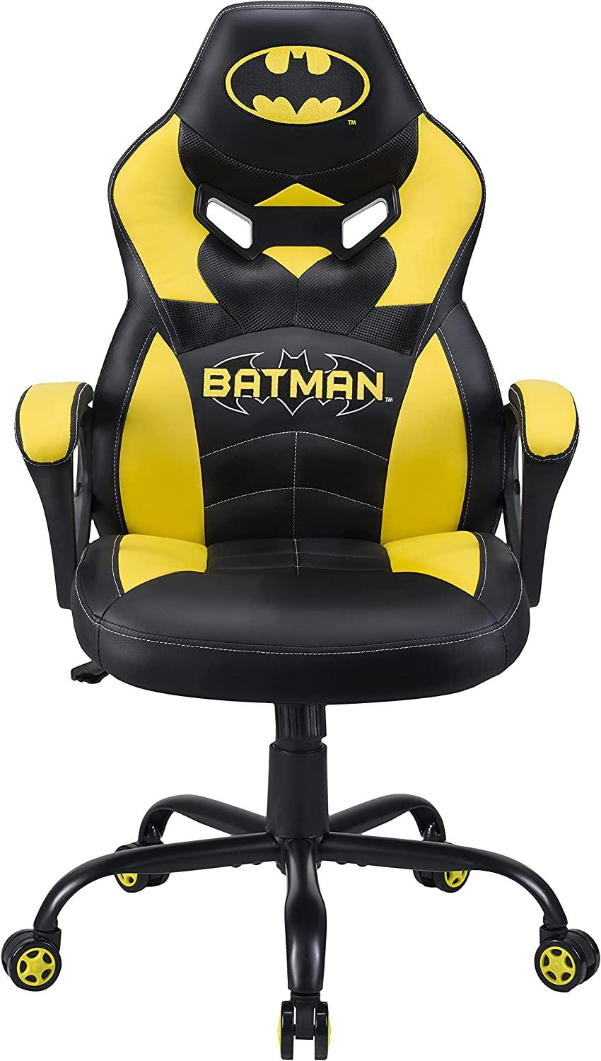 Der Subsonic Batman - Gamer Chair Junior ist der ideale Gaming-Stuhl für junge Spieler. Mit seiner ergonomischen Rückenlehne und der Lendenwirbelverstärkung beugt er Rückenschmerzen vor. Der ultra bequeme Sitz aus hochdichtem Schaumstoff mit 5 cm Dicke sorgt für langanhaltenden Komfort. Gepolsterte Armlehnen und eine robuste PU-Struktur garantieren Stabilität. Die hochwertige Verarbeitung und die leicht zu reinigende Oberfläche machen diesen Stuhl zu einem langlebigen Begleiter für Gaming und Arbeit. **Highlights** - Ergonomische Rückenlehne zur Vorbeugung von Rückenschmerzen - Hochdichter Schaumstoff für langanhaltenden Sitzkomfort - Gepolsterte Armlehnen für ermüdungsfreies Spielen - Robuste PU-Struktur für Langlebigkeit - Leicht zu reinigende, hochwertige Verarbeitung **Produkteigenschaften** - Material: PU (Polyurethan) - Sitzhöhenverstellung durch Class 4 "Gas lift" Mechanismus - Mit 5 PU-Rollen für einfache Beweglichkeit - Rocking Chair Sitzfunktion für mehr Komfort - Dekoriert mit Stickerei und Ziernähten - Einfach zu reinigende Oberfläche