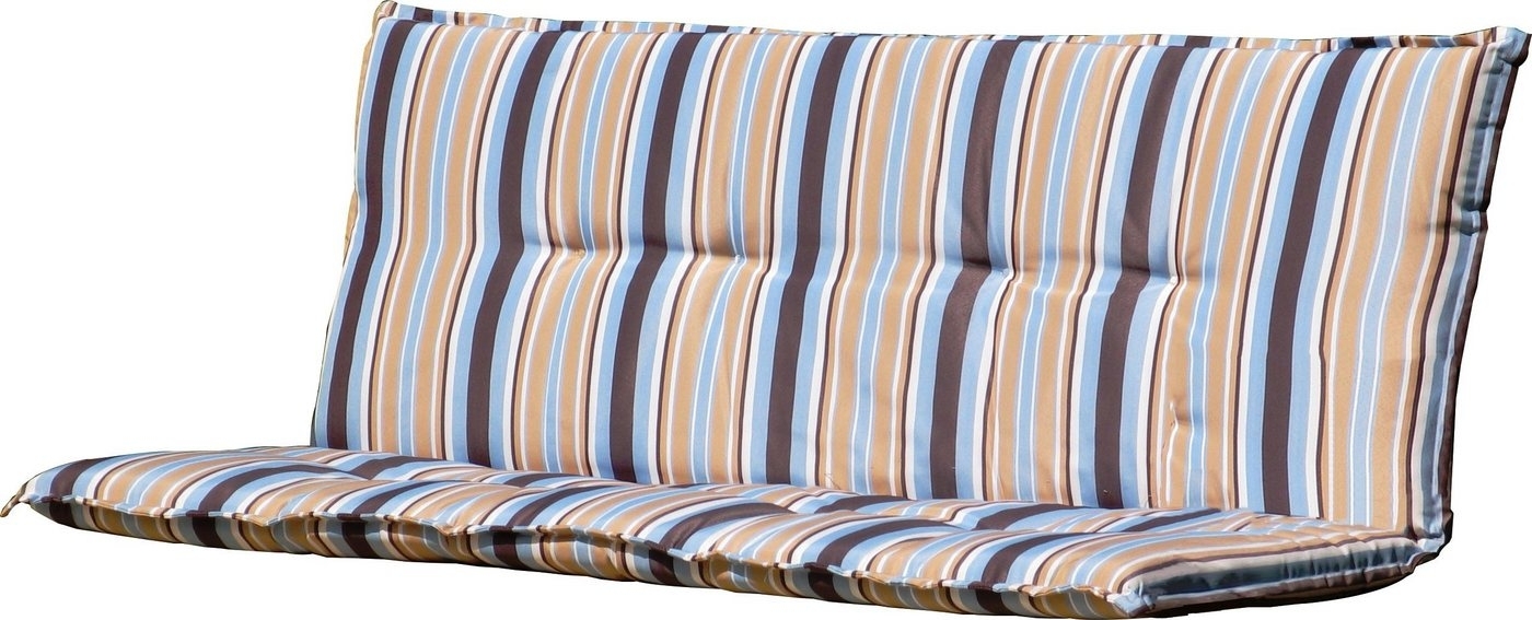 Hochwertige Bankauflage für 3sitzer - gestreiftes Design. Details Auflage ca.: * LxBxH ca. 138x92x5cm (ohne Stehsaum gemessen) * Sitztiefe: 45cm * Rückenhöhe: 47cm * Polsterung: 5cm * Stoff: 100% Polyester * Farbe: Marine (gestreift) * Gewicht: pro 150g/m² Sie suchen eine Auflage passend für Ihre Bank? Ihre Suche hat ein Ende - machen Sie es sich bequem. Zur Befestigung ist die Auflage an der Rückseite mit Kreuzgurten und im Sitzbereich mit Bändern versehen. Geeignet für alle Bänke mit den Maßen ca. LxBxH 150x50x93cm. Lieferumfang: * 1 Bankauflage **Die Bank wird nicht mitgeliefert.**