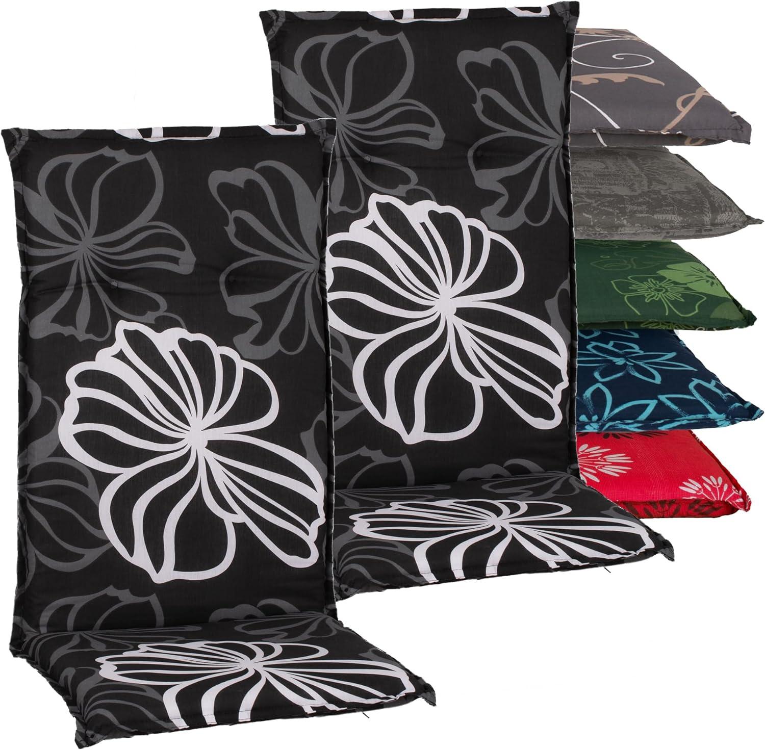 Beo Gartenstuhlauflagen Hochlehner 2er Set Barcelona Made in EU nach Öko-Tex Standard | Hochlehner Auflagen waschbar | Atmungsaktive Stuhlauflagen Hochlehner mit Blumen in Grau-Schwarz-Weiß