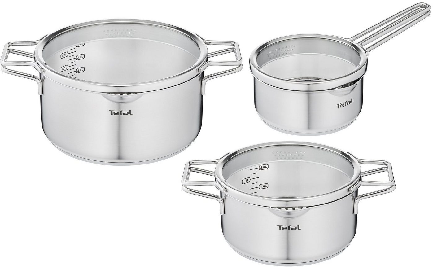 Das Tefal 6-teilige Topfset aus Edelstahl ist die ideale Ergänzung für Ihre Küche. Es umfasst einen 1,5-Liter-Kochtopf, einen 3-Liter-Schmortopf und einen 5-Liter-Schmortopf, die alle mit einem praktischen Glasdeckel ausgestattet sind. Dank des patentierten Doppelgriff-Systems und des integrierten Ausgießers mit Sieb im Deckel wird das Handling und Ausgießen zum Kinderspiel. Das Set ist für alle Herdarten, einschließlich Induktion, geeignet und spülmaschinenfest. **Highlights** - Patentiertes Doppelgriff-System für einfaches und sicheres Handling - Praktischer Glasdeckel für optimale Überwachung des Kochvorgangs - Gestapelte Aufbewahrungsmöglichkeit für Platzersparnis - Ausgießer und integriertes Sieb im Deckel für einfaches Ausgießen von Wasser - Geeignet für alle Herdarten, einschließlich Induktion **Produkteigenschaften** - Material: Edelstahl - Größen: 1,5-Liter-Kochtopf, 3-Liter-Schmortopf, 5-Liter-Schmortopf - Glasdeckel für alle Töpfe - Spülmaschinenfest **Lieferumfang** - 1x 1,5-Liter-Kochtopf - 1x 3-Liter-Schmortopf - 1x 5-Liter-Schmortopf - 3x Glasdeckel