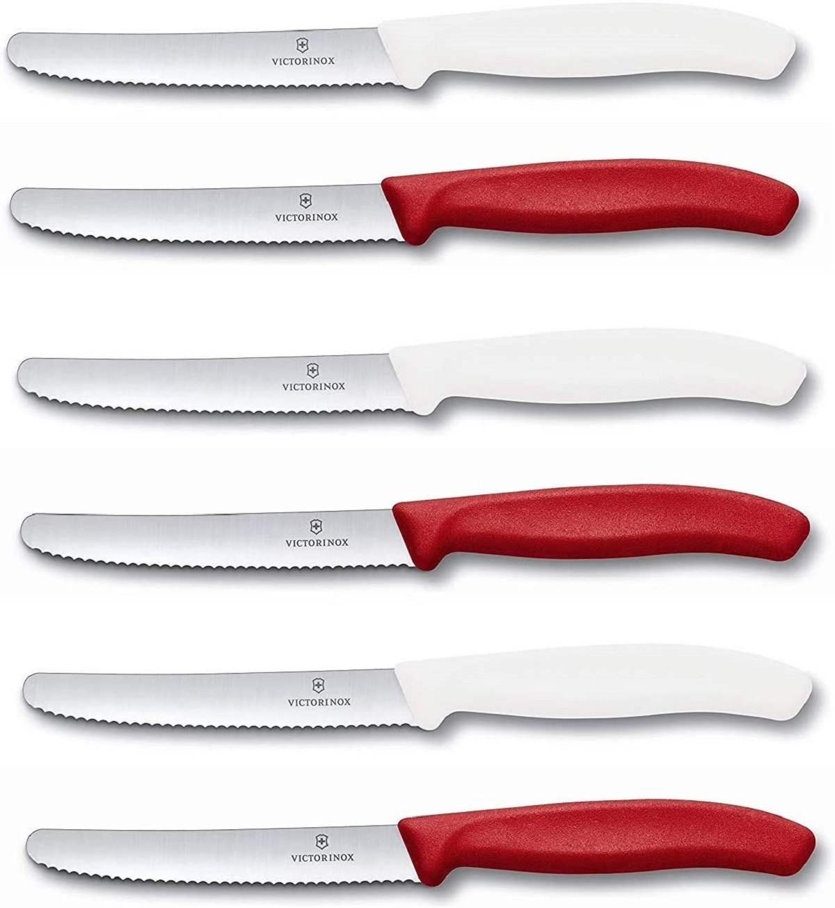 Victorinox 6 Stück Tafelmesser Neue Griffform Swiss Classic (Rot/Weiß) : Sie erwerben 6 Top-Brotzeitmesser aus der Messermanufaktur VICTORINOX. Wellenschliff, rostfreier Chromstahl / poliert strapazierfähige, angespritzte, Griffe aus Nylon PP Gesamtlänge: ca. 21,00 cm, Klingenlänge: ca. 11,50 cm Die Messer sind spülmaschinengeeignet und rostfrei! 3 weiße Tafelmesser und 3 rote Tafelmesser