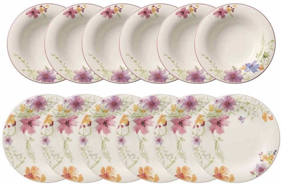 Villeroy & Boch Mariefleur Basic Tafel-Set 12-teilig Das Villeroy & Boch Mariefleur Basic Tafel-Set umfasst 6 Speiseteller und 6 Suppenteller, die mit einem zeitlosen Blumenmuster verziert sind. Die Speiseteller mit einem Durchmesser von ca. 27 cm sind ideal für Hauptgerichte, während die Suppenteller mit einem Durchmesser von ca. 23 cm perfekt für Suppen, Salate oder Vorspeisen geeignet sind. Hergestellt aus hochwertigem Premium Porcelain, sind die Teller spülmaschinenfest und mikrowellensicher. **Highlights** - 12-teiliges Tafel-Set mit 6 Speisetellern und 6 Suppentellern - Zeitloses Mariefleur Basic Blumenmuster - Großzügig dimensionierte Speiseteller für Hauptgerichte - Perfekt proportionierte Suppenteller für Suppen, Salate oder Vorspeisen - Spülmaschinenfest und mikrowellensicher **Produkteigenschaften** - Speiseteller Durchmesser: ca. 27 cm - Suppenteller Durchmesser: ca. 23 cm - Material: Premium Porcelain (Porzellan) **Lieferumfang** - 6 Speiseteller - 6 Suppenteller