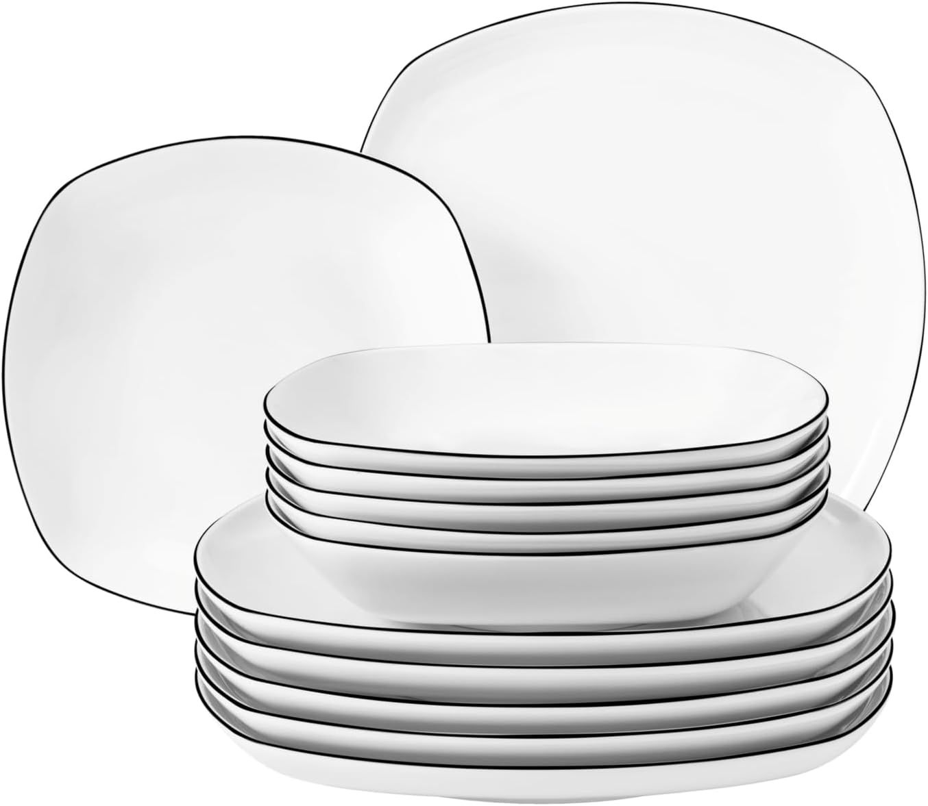 Das Seltmann Weiden Lido Black Line Tafelservice eckig 12-teilig kombiniert modernes Design mit italienischem Flair. Hergestellt aus klassischem weißen Hartporzellan, verleiht der auffällige schwarze Rand jedem Teil eine edle Note. Das Set umfasst 6 Speiseteller mit einem Durchmesser von ca. 26,2 cm und einer Höhe von ca. 3,1 cm sowie 6 Suppenteller mit einem Durchmesser von ca. 21 cm und einer Höhe von ca. 4,3 cm. Alle Teile sind spülmaschinen-, mikrowellen-, ofen-, kühlschrank- und gefrierschrankgeeignet. **Highlights** - Modernes Design mit italienischem Flair - Kombination aus klassischem Weiß und auffälligem schwarzen Rand - Geeignet für verschiedene Anlässe - Hohe Kantenschlagfestigkeit - Blei- und cadmiumfreie Glasur **Produkteigenschaften** - Material: Hartporzellan - Spülmaschinengeeignet - Mikrowellengeeignet - Ofenfest - Kühlschrankgeeignet - Gefrierschrankgeeignet - Maße Speiseteller: Durchmesser ca. 26,2 cm, Höhe ca. 3,1 cm - Maße Suppenteller: Durchmesser ca. 21 cm, Höhe ca. 4,3 cm - Inhalt Suppenteller: ca. 800 ml **Lieferumfang** - 6x Speiseteller - 6x Suppenteller - Inhalt: ca. 800 ml