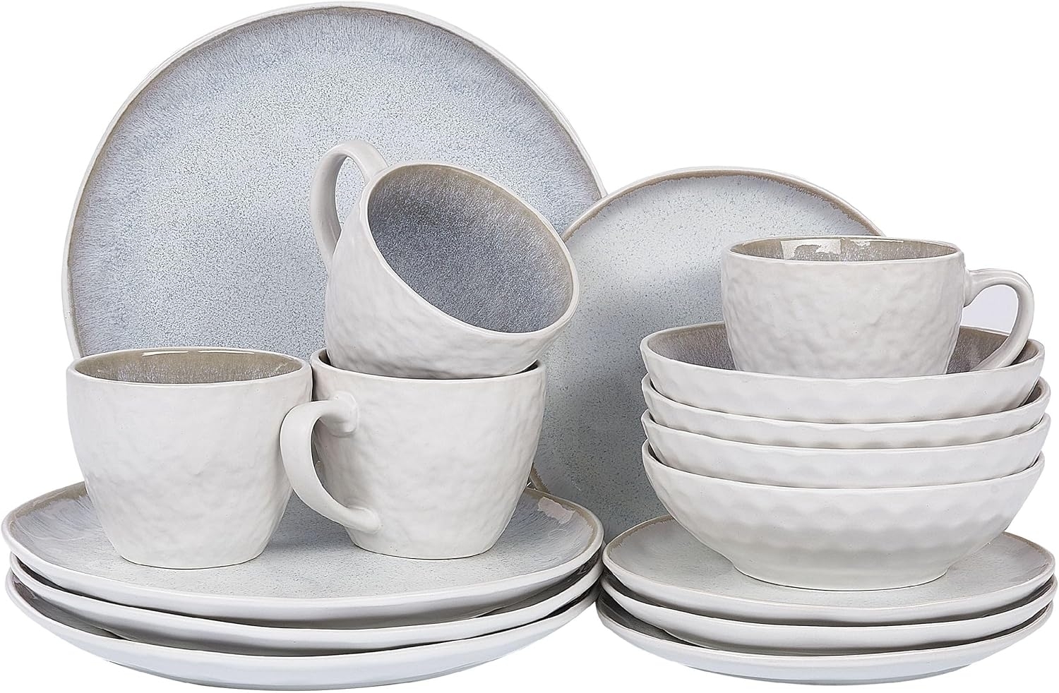 Handgefertigtes, hellgraues Geschirr Set aus hochwertiger Keramik für 4 Personen . Decken Sie Ihren Tisch mit diesem einzigartigen Essgeschirr-Set und bringen Sie einen umwerfenden Look zustande. Das Set ist aus langlebigem Steinzeug von Hand gefertigt, besitzt eine strukturierte Oberfläche und besteht aus 16 Elementen, die für ein Mahl unter bis zu 4 Personen perfekt sind. So ist dieses Tafelgeschirr eine ausgezeichnete Wahl für kleine Haushalte, Einweihungsfeiern oder andere besondere Anlässe. Die helle Farbwahl erlaubt es Ihnen, die Aufmerksamkeit auf Ihre Gerichte zu lenken und diese bei jeder Gelegenheit zu präsentieren. Dank der reaktiven Glasur erhält jeder Teller, jede Schüssel und jeder Becher einen originellen Farbverlauf und damit auch einen ganz besonderen Charme. Außerdem ist das Speiseservice spülmaschinen- und mikrowellengeeignet. **Details:** **Typ** Tafelservice **Stil:** Klassisch **Farbe:** Grau **Farbton:** Hellgrau **Material:** Steinzeug **Zusätzliches Material:** Ton **Form:** Rund **Finish:** Reaktive Glasur **Dimensions:** **Gesamtmasse:** 27 x 27 x 10 **Gewicht:** 8.6 kg **Sie kaufen:** 4 x Speiseteller, 4 x Dessertteller, 4 x Schale, 4 x Tasse **Produktvorteile:** Zeitloses Design, Hochwertiges Material, Handgefertigte Präzision, Spülmaschinengeeignet, Mikrowellengeeignet **Montage:** Benötigt keine Montage **Pflegeanleitung:** **Steinzeug:** 1.Spülmaschinen- und Mikrowellengeeignet.