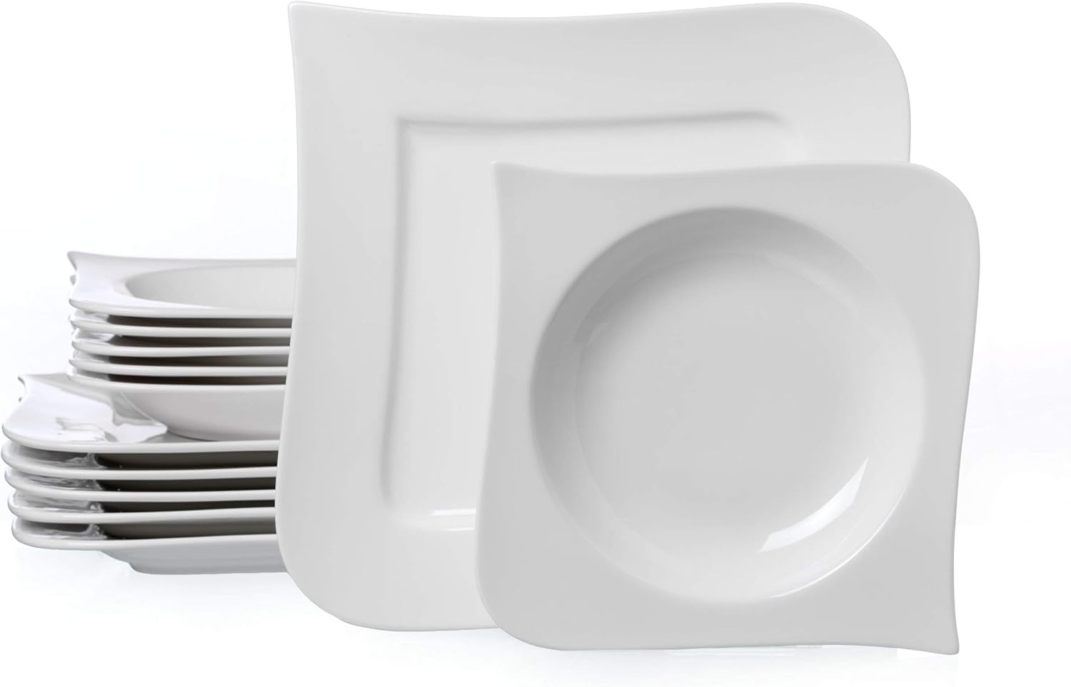 Ritzenhoff & Breker Melodie Tafelservice 12-teilig vereint elegante, geschwungene Formen in einem harmonischen Design. Dieses Geschirr kommt ohne Dekor aus und zieht durch seine extravagante Formensprache alle Blicke auf sich. Der Speiseteller mit einem Durchmesser von 28 cm erfüllt gehobene Ansprüche an die Speisenpräsentation. Das Tafelservice ist spülmaschinenfest und eignet sich für jeden Anlass. **Highlights** - Elegantes, geschwungenes Design - Ohne Dekor für einen klaren Look - Speiseteller mit 28 cm Durchmesser - Spülmaschinenfest für einfache Reinigung - Ideal für jeden Anlass **Produkteigenschaften** - Material: Porzellan - Speiseteller: Durchmesser ca. 28 cm, Höhe ca. 3 cm - Suppenteller: Durchmesser ca. 21 cm, Höhe ca. 3,5 cm **Lieferumfang** - 6x Speiseteller - 6x Suppenteller