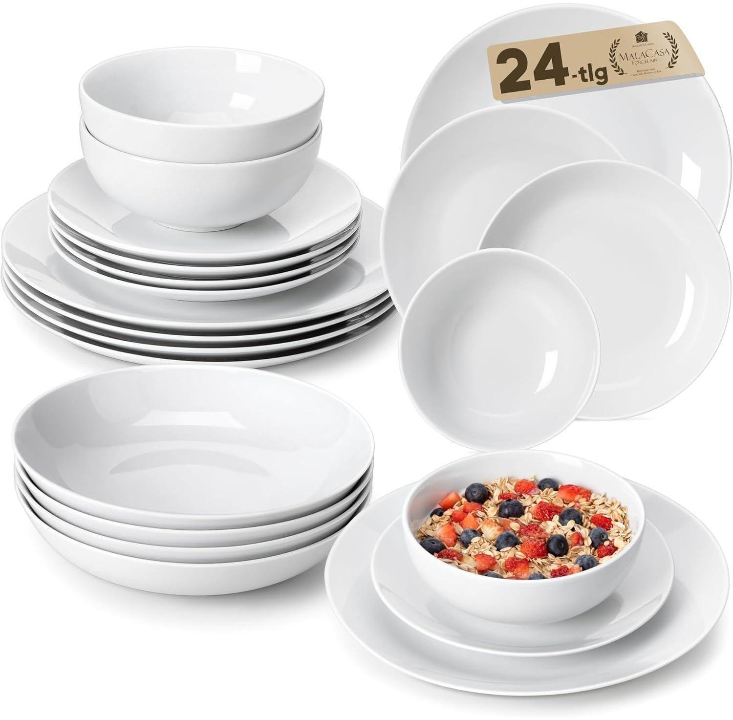 - **MALACASA** - Hochwertiges 24-teiliges Geschirrset für 6 Personen - **Gourmet Porzellan** - Exklusives, elegantes Tafelservice in klassischem Weiß - **Premium Qualität** - Hitzebeständig, sicher in Mikrowelle, Ofen und Spülmaschine - **Vielseitig einsetzbar** - Perfekt für den täglichen Gebrauch und besondere Anlässe - **Lebensmittelecht** - Ungiftig, stapelbar und minimalistisches Design für moderne Küchen **12 MONATE GARANTIE & KUNDENSERVICE** - Unsere 12-monatige Garantie unterstützt Ihren Kauf gegen Beschädigung oder Herstellerfehler. Bitte zögern Sie nicht, bei Fragen zuerst unseren Kundenservice zu kontaktieren. Vielen Dank! **VIELSEITIGES & SCHÖNES GESCHENK** - Diese Teller und Schalen sind perfekt für Ihre Lieblingsspeisen, wie z.B. Dessert, Salat, Pasta, Vorspeisen, verschiedene Käse usw. Außerdem ist es perfekt für den täglichen Gebrauch, Familientreffen, formale Bankett oder besondere Anlässe Geschenk, wie Thanksgiving, Weihnachten, Neujahr, Geburtstage, Jubiläen etc. **EINZIGARTIGES DESIGN & SICHERHEIT GARANTIERT** - Mit zeitlosem Design in klassischem Weiß bieten Ihnen ein fantastisches Esserlebnis und einen angenehmen Moment. Das Tafelservice ist hitzebeständig, sicher im Ofen, in der Mikrowelle und in der Spülmaschine, aber bitte vorsichtig, wenn Sie es aus der Mikrowelle nehmen. Sicherheit, Langlebigkeit und Funktionalität machen unser MALACASA Geschirr set zu etwas Besonderem in Ihrem Schrank. **MINIMALISTISCHES DESIGN** - Unser lebensmittelechtes Porzellangeschirr wird bei hoher Temperatur gebrannt, ist ungiftig und lässt sich gut stapeln. Es eignet sich perfekt für den täglichen Gebrauch, für Feiertage und zum Verschenken. Das klassische Weiß mit schwarzer Zierleiste passt gut zu Ihrer aktuellen Küchenästhetik und verleiht ihr einen stilvollen Touch. **WAS SIE BEKOMMEN** - MALACASA Gourmet Porzellan geschirr für 6 Personen, bestehend aus 10,7” Speiseteller, 8,1” Dessertteller, 1160ml Suppenteller und 780ml Schüssel. Dieses weiße Geschirrset enthält alles, was Sie brauchen, perfekt für elegante Mahlzeiten und den täglichen Gebrauch, im Urlaub oder zu besonderen Anlässen mit Familie und Freunden.