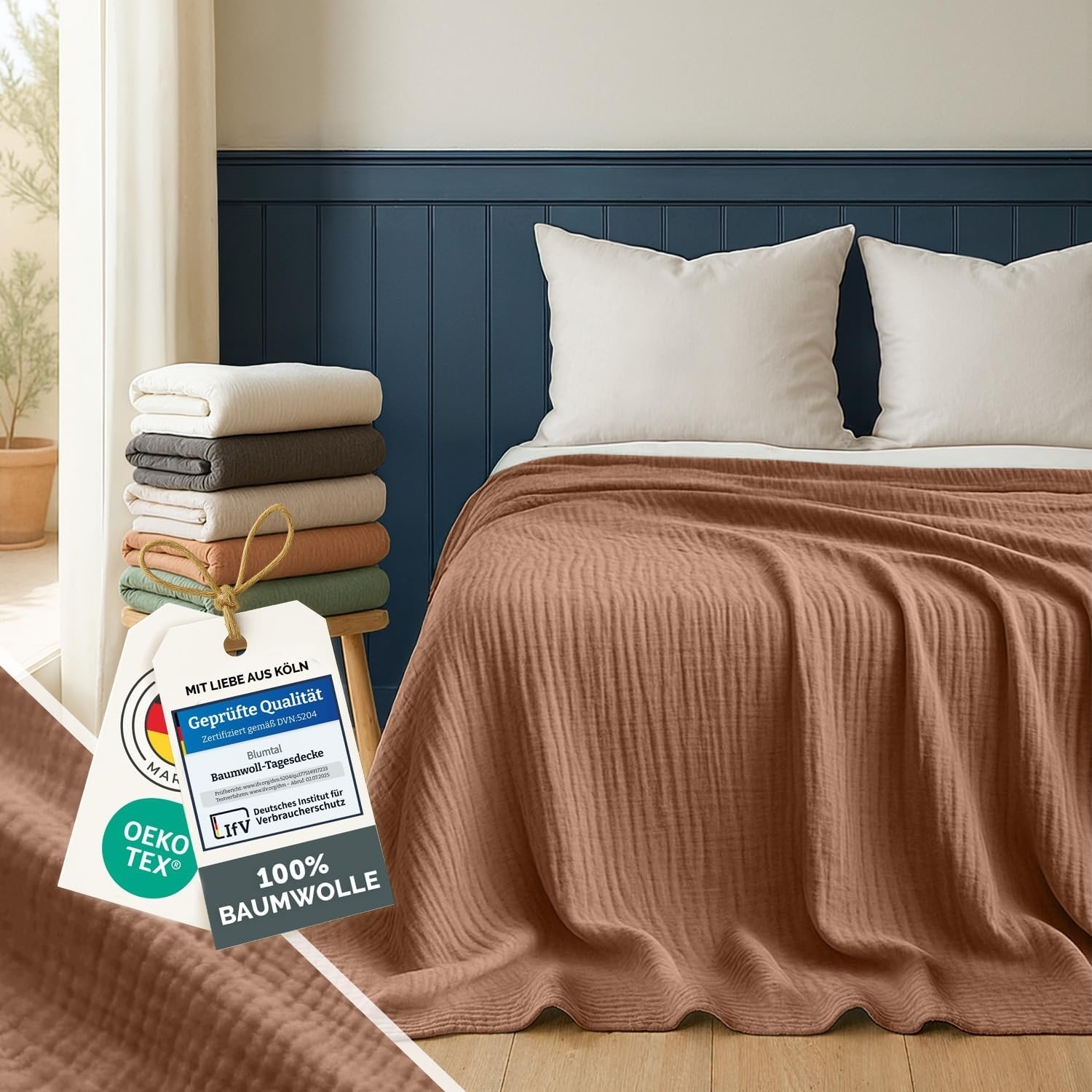 | Name | Blumtal Tagesdecke Tagesdecke Baumwolle - Musselin Decke Oeko-TEX zert. - Bettüberwurf, Couch Überwurf - leichte Kuscheldecke Baumwolle 100% |