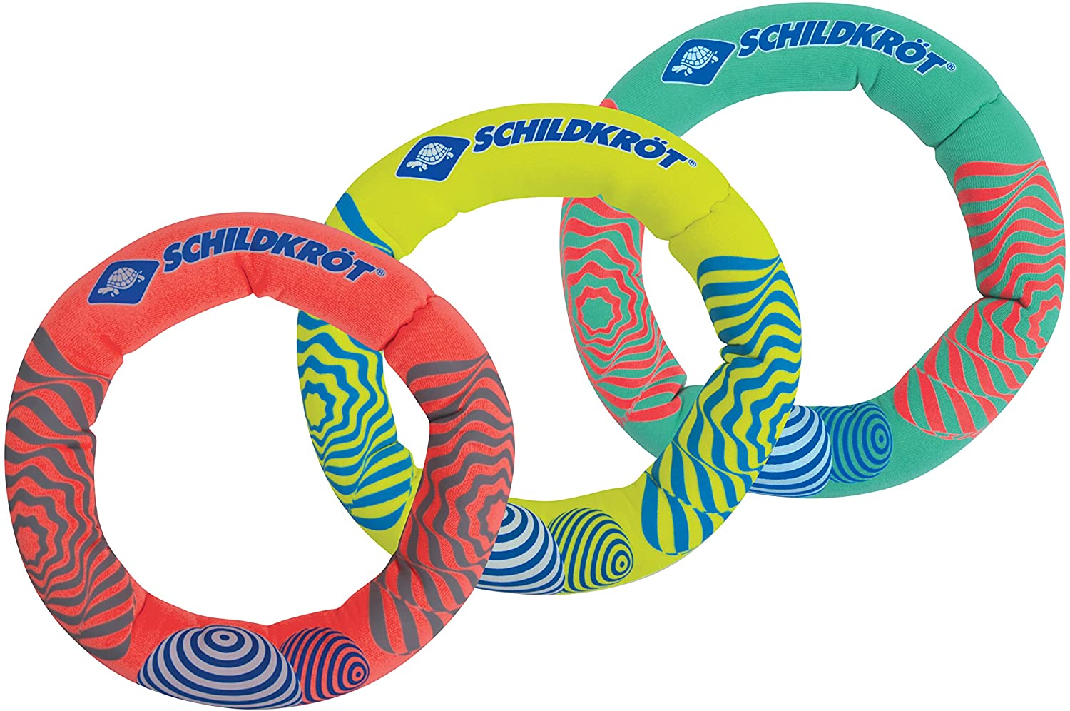 Die 3 Tauchringe von Schildkröt aus Neopren sind zu 3/4 mit Sand gefüllt. Durch einen zusätzlichen Schaumstoffeinsatz stehen die Ringe unter Wasser aufrecht am Grund und sind somit für Kinder leicht zu ertauchen. Das weiche & griffige Neopren-Material ist angenehm zu greifen. Kinder haben dadurch ein schnelles Tauch-Erfolgserlebnis und einen Riesen-Spaß. Die leuchtenden Farben ermöglichen es, die Ringe gut im Wasser zu sehen. Durch die "weiche" Konstruktion tut es nicht weh, wenn der Ring auf die Füße fällt - bei Hartplastik-Tauchringen ist das anders! Das Set ist auch ein ideales Geschenk zum Kindergeburtstag! Ein toller Spiel- und Tauchspaß im Wasser! Über Schildkröt: Die über 100 Jahre alte deutsche Marke Schildkröt gilt als Erfinder des Tischtennisballs. Heute bietet Schildkröt neben Tischtennis auch eine sehr umfangreiche Funsport-, Rollsport- und Fitness-Kollektion an und gilt in gewissen Bereichen als Marktführer. Die Produktentwicklung erfolgt ausnahmslos in Deutschland. Die weltweiten Produktionsstätten werden streng überwacht und genügen höchsten Sozialstandards. ACHTUNG! Nur im flachen Wasser unter Aufsicht von Erwachsenen verwenden. Artikel nach Gebrauch mit klarem Wasser abspülen und ausreichend trocknen.