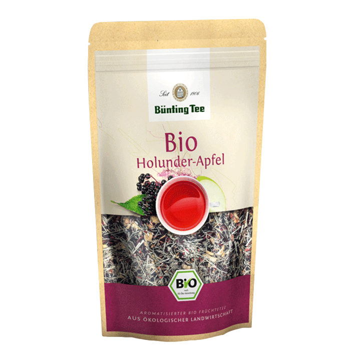 - Die Zutaten des Bünting Tee Bio Holunder-Apfel umfassen Hibiskus, Zitronengras, Apfel (14%), Süßholz und Holunderbeeren (10%) und sind aus kontrolliert biologischem Anbau