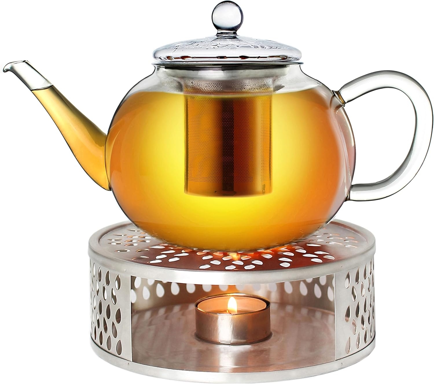 Creano Teekanne Creano Teekanne aus Glas 1,2l + ein Stövchen aus Edelstahl3-teilige, (Set, 4-St)