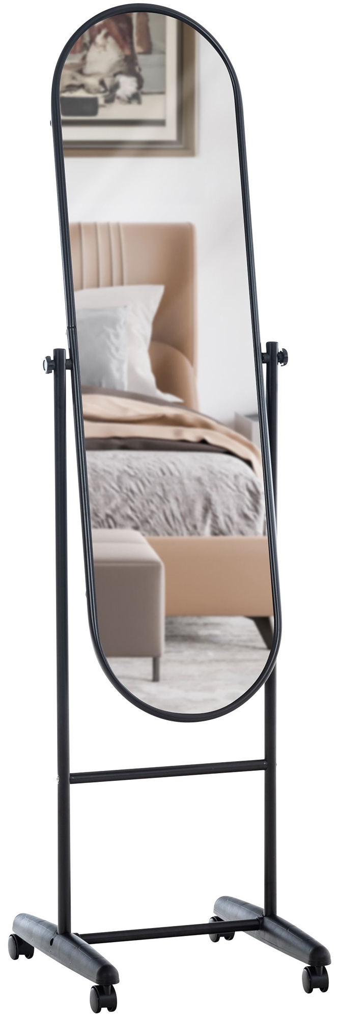Der Standspiegel Nane Oval ist die perfekte Ergänzung für Ihr Zuhause. Mit seinem eleganten, ovalen Design und einem stabilen Metallrahmen fügt er sich harmonisch in jedes Wohn- oder Schlafzimmer ein. Die neigbare Spiegelfläche von 113 x 33 cm ermöglicht eine optimale Sicht für Ihr tägliches Styling. Dank der leichtgängigen Rollen lässt sich der Spiegel mühelos bewegen, während zwei Rollen mit Bremsen für sicheren Halt sorgen. **Highlights** - Vielseitiges, modernes Design - Stabiler Metallrahmen mit MDF-Rückwand - Leichtlaufrollen mit Stopper für einfache Mobilität - Neigbare Spiegelfläche für individuelle Einstellung - Große Sichtfläche für eine klare Ganzkörperansicht **Produkteigenschaften** - Gesamthöhe: 155 cm - Gesamtbreite: 40 cm - Gesamttiefe: 42 cm - Spiegelfläche: 113 x 33 cm - Abstand Spiegelfläche vom Boden: 42 cm - Gewicht: 5 kg