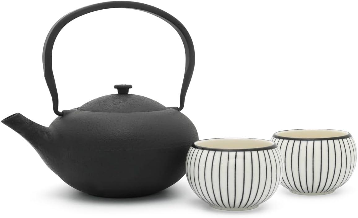 Das Bredemeijer Tee-Set Shanxi ist das ideale Geschenk für Teeliebhaber. Es umfasst eine gusseiserne Teekanne mit emaillierter Innenseite und einem Fassungsvermögen von 1,0 Liter. Die Teekanne hat eine Breite von 19 cm, eine Höhe von 14,6 cm und eine Tiefe von 19 cm. Das Set beinhaltet zudem zwei Porzellantassen und einen Edelstahlfilter, alles in einer ansprechenden Geschenkverpackung. **Highlights** - Hochwertiges Gusseisen: Sorgt für eine gleichmäßige Wärmeverteilung. - Emaillierte Innenseite: Verhindert das Anhaften von Tee und erleichtert die Reinigung. - Mit Streifenmotiv: Verleiht der Teekanne eine elegante Optik. - Inkl. 2 Tassen und Edelstahlfilter: Komplettset für Teegenuss. - In Geschenkverpackung: Ideal als Geschenk für besondere Anlässe. **Produkteigenschaften** - Farbe: schwarz / weiß - Material: Gusseisen - Breite: 19 cm - Höhe: 14,6 cm - Tiefe: 19 cm - Durchmesser: 19 cm - Gewicht: 1,65 kg - Volumen: 1 l **Lieferumfang** - 1x Teekanne - 1x Edelstahlfilter - 2x Porzellantassen