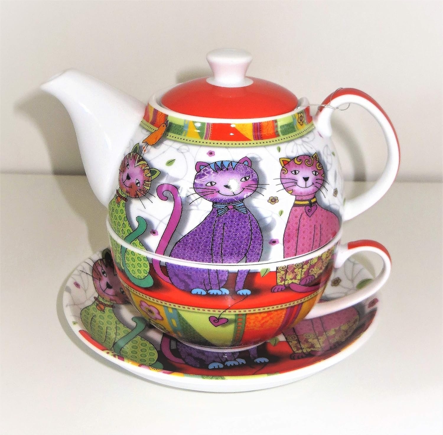 Fröhlich-bunte Katzenmotive findet man auf dem Tea for one Set "Evi" aus hochwertigen Porzellan. Tea for one "Evi" vereint Teekanne und Teetasse in einem Set. Einfach ein Genuss - besonders für Single-Teetrinker!