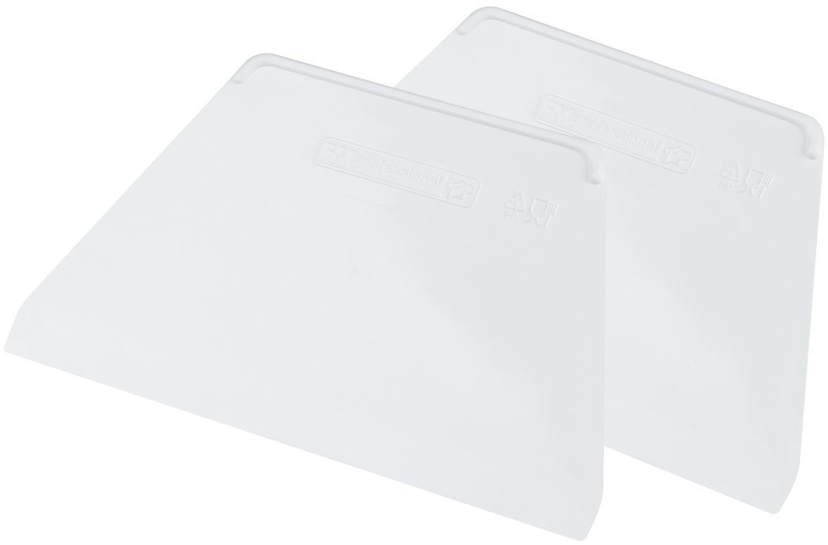 Die trapezförmigen Teigschaber von FMprofessional sind ideale Küchenhelfer für das Glattstreichen und Dekorieren von Torten und Kuchen. Mit zwei unterschiedlich langen Seiten ermöglichen sie ein gleichmäßiges Verteilen von Teigen und Crèmes. Die Schaber haben eine Größe von ca. 22 x 13 cm und sind aus lebensmittelechtem Kunststoff gefertigt. Nach dem Gebrauch können sie problemlos in der Spülmaschine gereinigt werden. **Highlights** - Trapezform für einfaches Glattstreichen - Zwei unterschiedlich lange Seiten für vielseitige Anwendung - Spülmaschinengeeignet für einfache Reinigung - Lebensmittelechter Kunststoff für sichere Nutzung - Professionelle Qualität von FMprofessional **Produkteigenschaften** - Maße: ca. 22 x 13 cm - Farbe: Weiß - Set-Bestandteile: 2 x Teigschaber **Lieferumfang** - 2 x Teigschaber - Ausschluss von weiteren Produkten