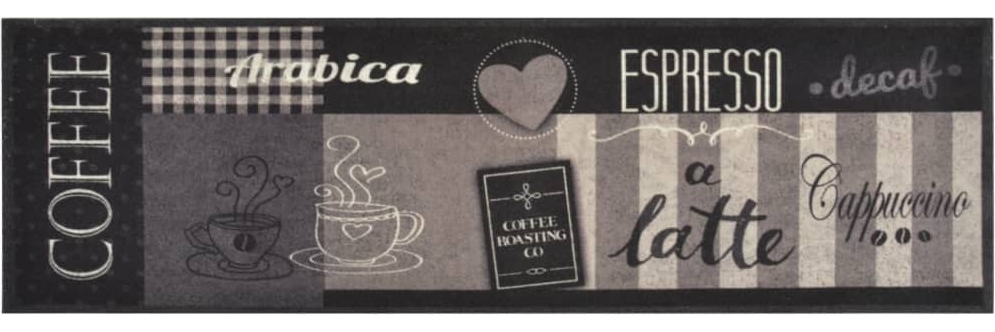 Dieser elegante Küchenteppich in der Farbe Coffee vereint Stil und Funktionalität. Mit einer Größe von 150 x 45 cm und einer Gesamthöhe von 5 mm bietet er nicht nur Komfort, sondern auch Sicherheit durch die rutschfeste Latexunterseite. Der weiche Samtstoff ist maschinenwaschbar und sorgt für eine einfache Reinigung. Ideal für den Innen- oder Außenbereich, lässt sich der Teppich zudem bequem aufrollen und verstauen. **Highlights** - Strapazierfähiges Material: Weicher Samtstoff, der Wasser und Schmutz schnell aufnimmt - Rutschfeste Latexunterseite: Bietet Sicherheit vor dem Ausrutschen - Maschinenwaschbar: Einfache Reinigung für den täglichen Gebrauch - Bequeme Aufbewahrung: Flexibel und leicht aufzurollen - Ideal für Innen- oder Außenbereich: Vielseitig einsetzbar **Produkteigenschaften** - Druck: Coffee - Oberschicht-Material: Samt (100% Polyamid) - Unterschicht-Material: Latex - Größe: 150 x 45 cm (L x B) - Gesamthöhe: 5 mm - Florhöhe: 4 mm - Gesamtgewicht: 1180 g/m² - Flor-Dichte: 205.000 /m²