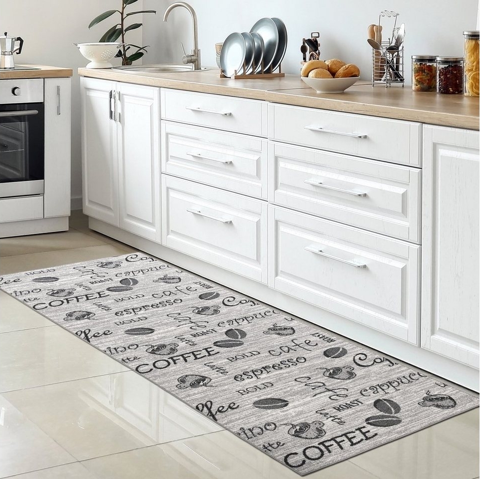 Der Carpetia Teppich Küchenläufer in grau mit Gelrücken und schwarzem Schriftzug ist das ideale Accessoire für Ihre Küche. Mit einer Höhe von 5 mm bietet er nicht nur eine rutschfeste Unterlage, sondern auch einen modernen Look mit den Wörtern Coffee, Espresso und Latte. Der strapazierfähige und pflegeleichte Küchenläufer schützt Ihre Arbeitsfläche vor Kratzern und Flecken und ist zudem für Allergiker geeignet. **Highlights** - Rutschfester Gelrücken für stabile Unterlage - Modernes Design mit Schriftzug in schwarz - Pflegeleicht und maschinenwaschbar - Für Fußbodenheizung geeignet - Schmutzabweisend und strapazierfähig **Produkteigenschaften** - Maße (H): 5 mm - Teppich Farbe: grau, schwarz - Gesamtgewicht: 1250 g/m² (ca.) - Material: 100 % Merilon Frisee, Polypropylene - Maschinengewebt - Für Allergiker geeignet