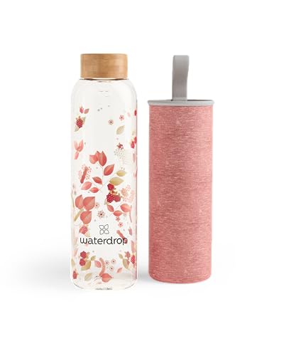Waterdrop® Edition Glass Bottle 600ml Trinkflasche Glas auslaufsicherKohlensäure geeignet | BPA freie Wasserflasche inkl. Neoprenhülle | Spülmaschinenfeste, Leichte Borosilikat Glasflasche