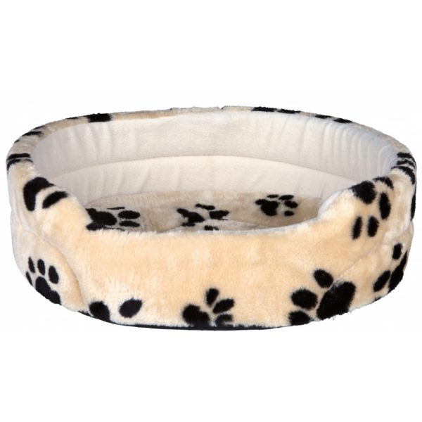 - Die Pfotenmusterung auf dem Bett ist in einem warmen Braunton gestaltet.