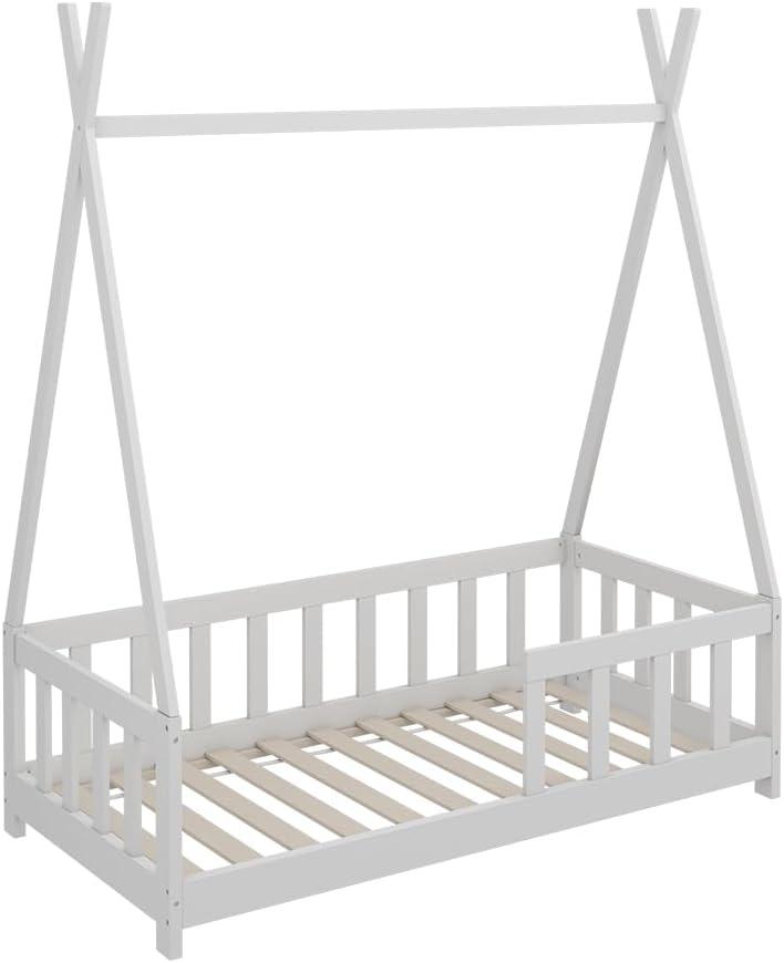 Das Kinderbett Susanna überzeugt durch sein modernes Tipi-Design und bietet eine sichere Schlafumgebung für Ihr Kind. Mit den Maßen von 146 x 164 x 76 cm (BxHxT) und einem Gewicht von 20,5 kg ist es stabil und robust. Die Melaminharzbeschichtung sorgt für eine pflegeleichte Oberfläche, während die erhöhte Umrandung als Rausfallschutz dient. Das Massivholz-Dachgestell garantiert zusätzliche Stabilität. **Highlights** - Modernes Tipi-Bett-Design für individuelle Dekoration - Rausfallschutz durch Zaunumrandung für mehr Sicherheit - Stabilität durch Massivholz-Dachgestell - Pflegeleichte Melaminharzbeschichtung - Einfache Montage dank beiliegendem Montagematerial **Produkteigenschaften** - Maße (BxHxT): 146 x 164 x 76 cm - Gewicht: 20,5 kg - Material: Dachgestell aus Massivholz, Bettkasten und Umrandung aus 18 mm Spanplatte, melaminharzbeschichtet - Farbe: Gestell in Weiß, matt; Lattenrost in Natur, matt **Lieferumfang** - 1 Kinderbett inkl. Montagematerial und -anleitung - Dekoration nicht im Lieferumfang
