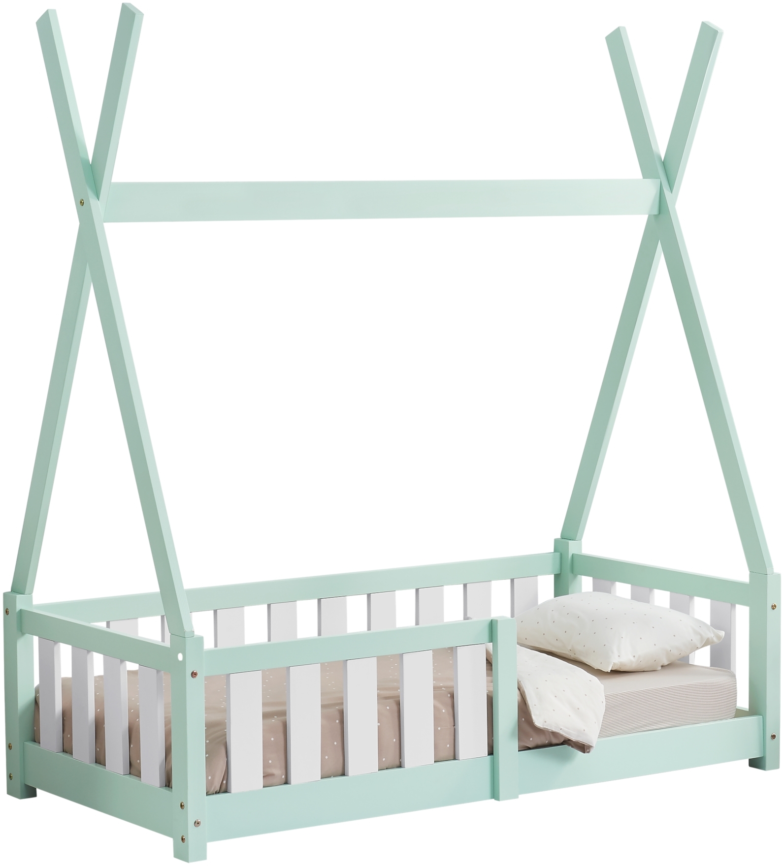 Das Kinderbett Helsingborg in der Größe 70 x 140 cm bietet einen stabilen und gemütlichen Schlafplatz für Ihr Kind. Hergestellt aus hochwertigem Kiefernholz und in einem matten Mintgrün lackiert, verleiht es jedem Kinderzimmer eine einladende Atmosphäre. Die Tipi-Optik und der integrierte Rausfallschutz sorgen für Sicherheit und ein Gefühl von Abenteuer. Die Montage ist einfach und unkompliziert. **Highlights** - Stabiles Kinderbett in Tipi-Optik - Einfache Montage - Mit Rausfallschutz **Produkteigenschaften** - Gesamtmaße (LxBxH): 146 x 76 x 165 cm - Matratzenmaße (LxB): 140 x 70 cm - Betteingang (LxH): 65 x 12 cm - Rausfallschutz (LxH): 75 x 40 cm - Länge der Dachschräge: 130 cm - Material: Kiefernholz - Farbe: Mintgrün, matt lackiert **Lieferumfang** - 1 x Kinderbett - 1 x Standard Lattenrost (einfache Ausführung) - Matratze, Kissen, Decke und weitere Deko-Gegenstände sind nicht im Lieferumfang enthalten.